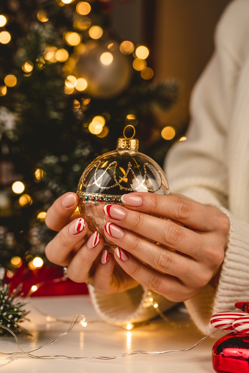 Red and white diagonal stripes on a few accent nails, keeping the rest nude.