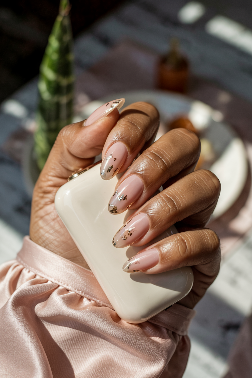 A glossy nude almond base sprinkled with tiny gold flakes gives it a soft luxury feel.