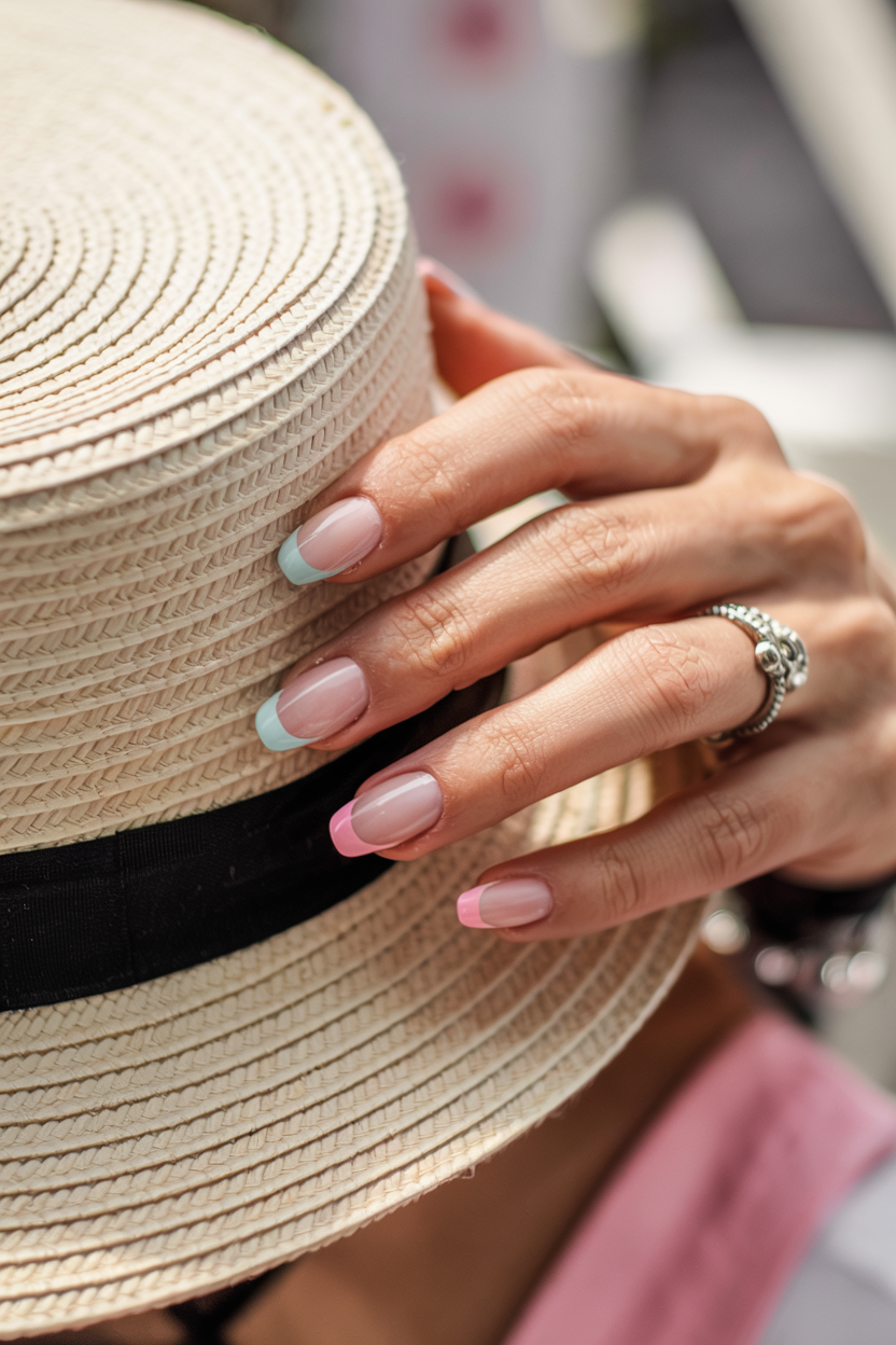 Each tip has a different pastel shade, creating a soft rainbow across the nails.