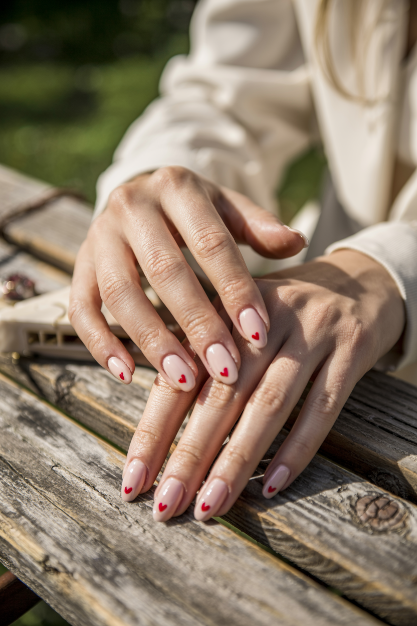 Tiny hand-painted hearts near the cuticle add a cute but polished vibe.