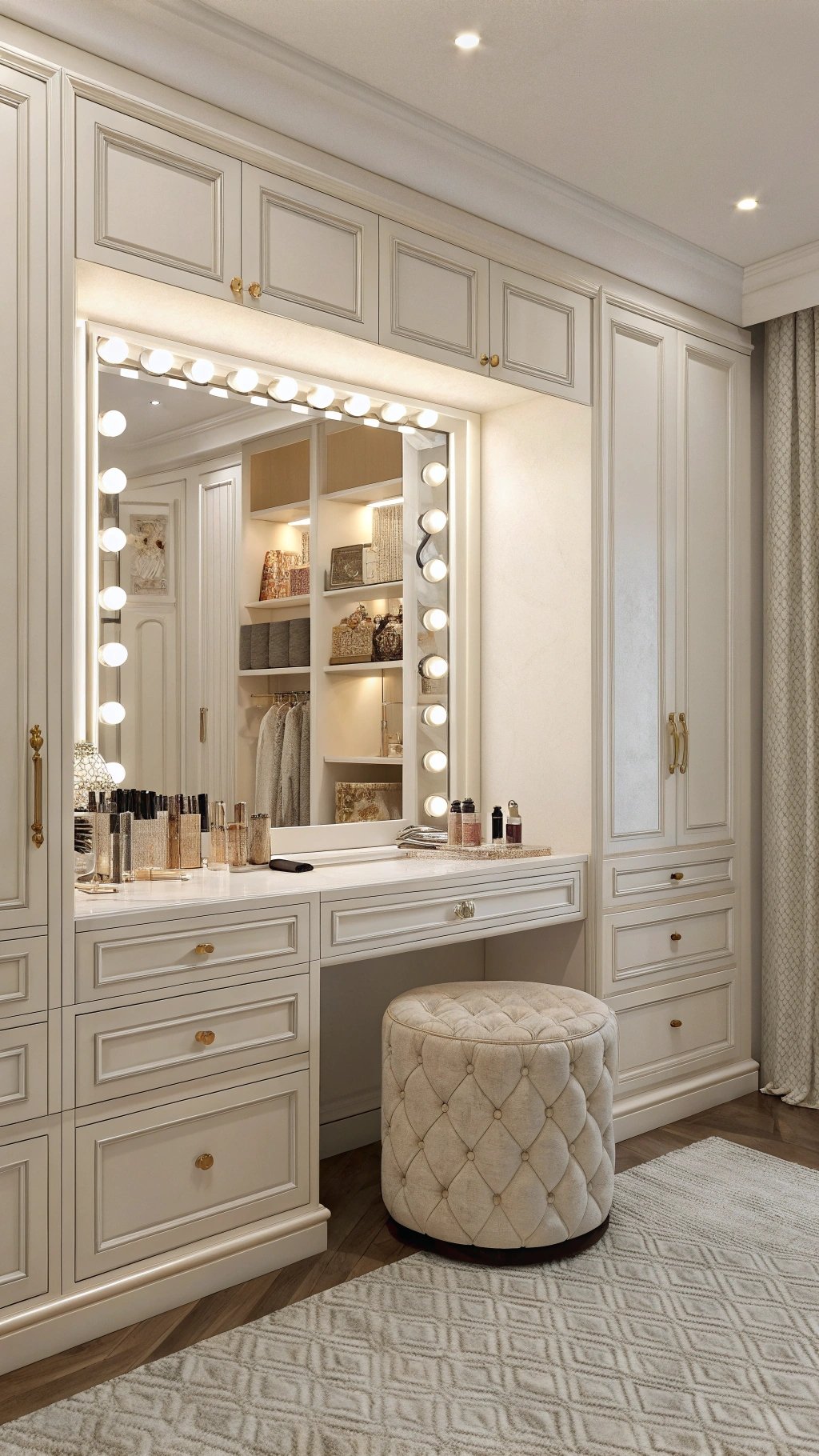 Including a built-in vanity allows the closet to serve as both a dressing and beauty area.