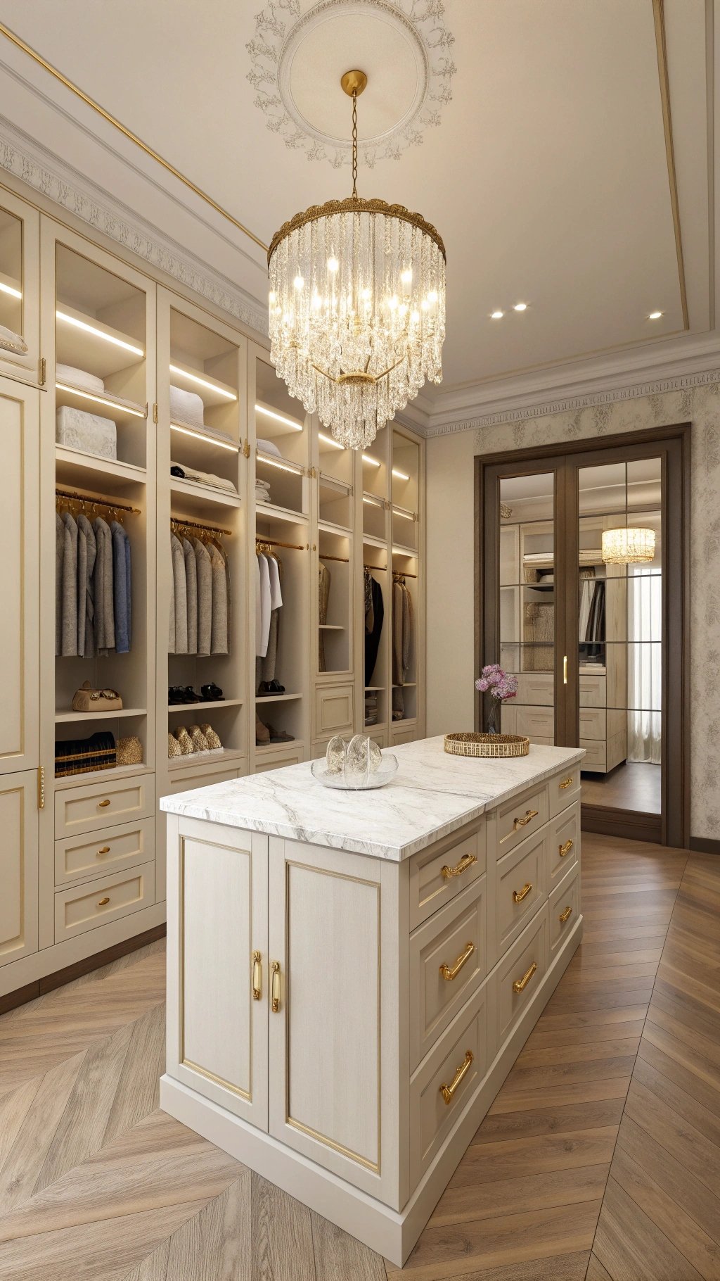 It acts as the focal point of the closet, often topped with marble or glass for elegance, and drawers can be customized to store watches, ties, or makeup.