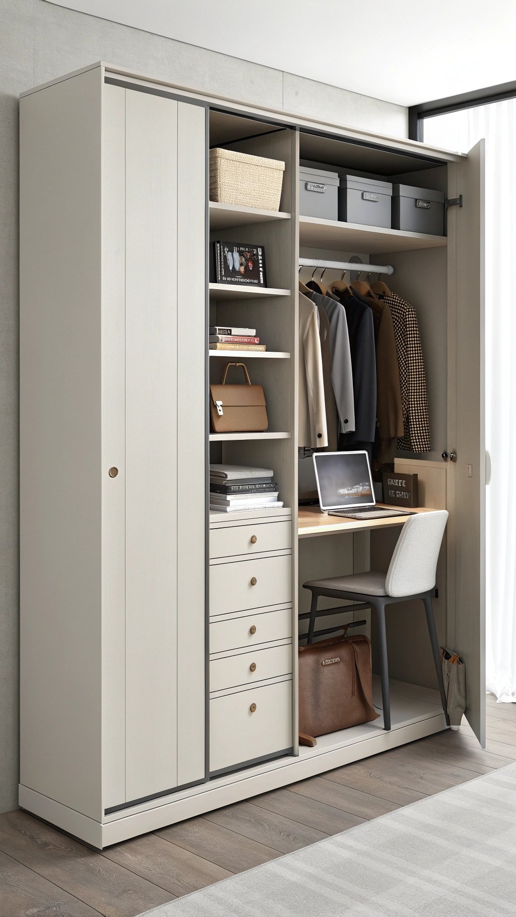 This adaptable closet can transform into a guest room, office, or hobby space with foldable and hidden storage units.