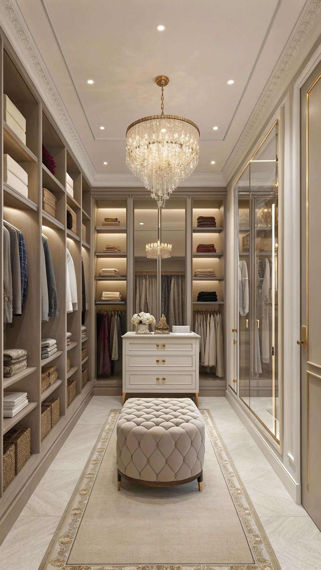 It’s all about atmosphere. Decorative mirrors, accent lighting, and velvet upholstery create an indulgent shopping-like space where getting ready feels like a daily treat.