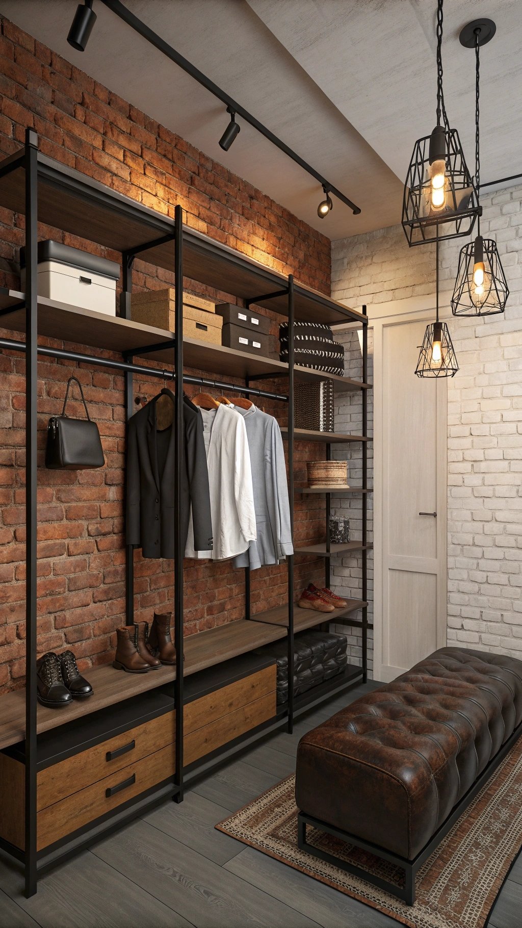 It merges raw, unfinished textures with luxury organization. The industrial theme creates a unique statement while remaining highly functional.