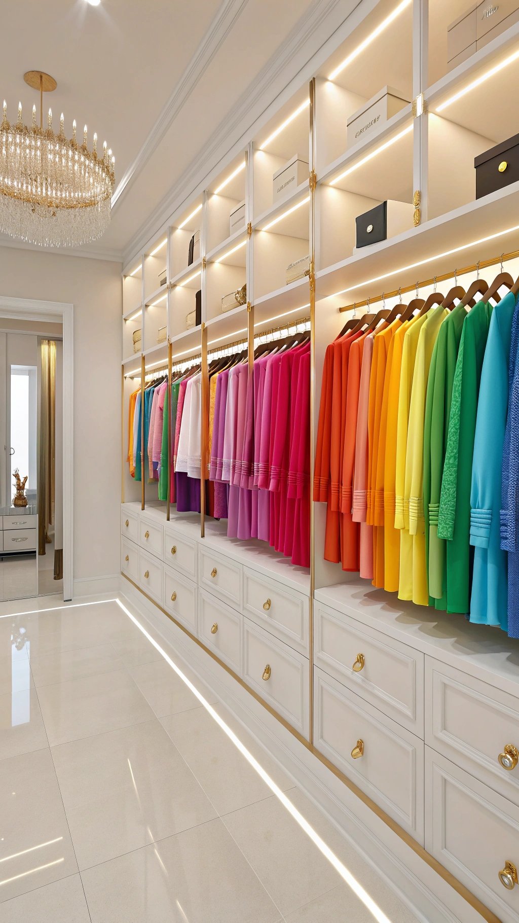 Clothing is arranged by color, creating a visually stunning rainbow effect across the closet.