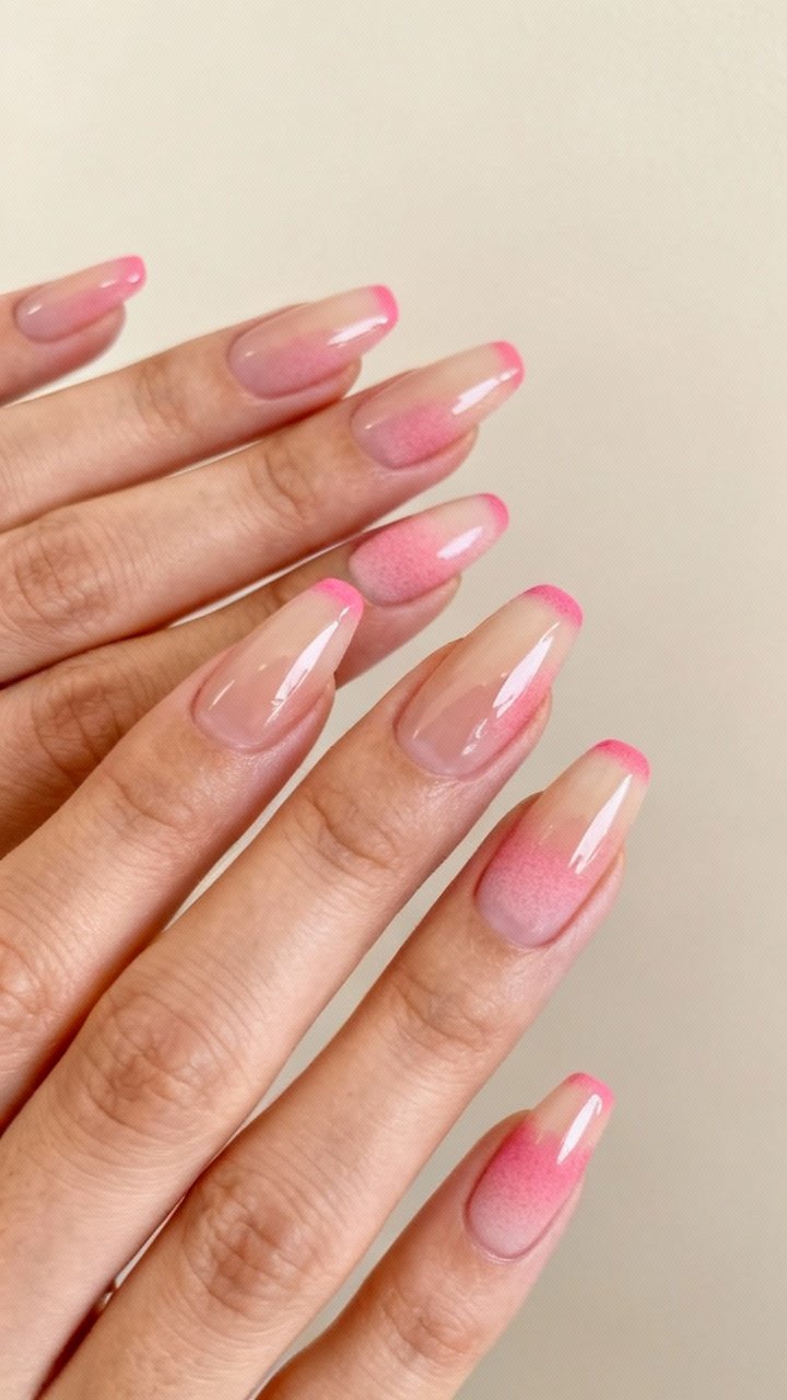 Fade from natural nude to soft rose at the tips for a petal-dipped effect. It’s romantic, effortless, and photogenic.