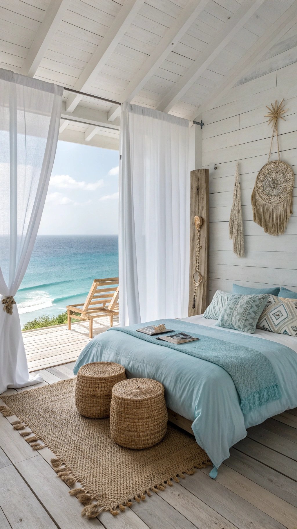 Soft whites, ocean blues, and sandy beiges bring beach serenity indoors. Sheer drapes and woven accents make the space feel light and open, like a fresh sea breeze.