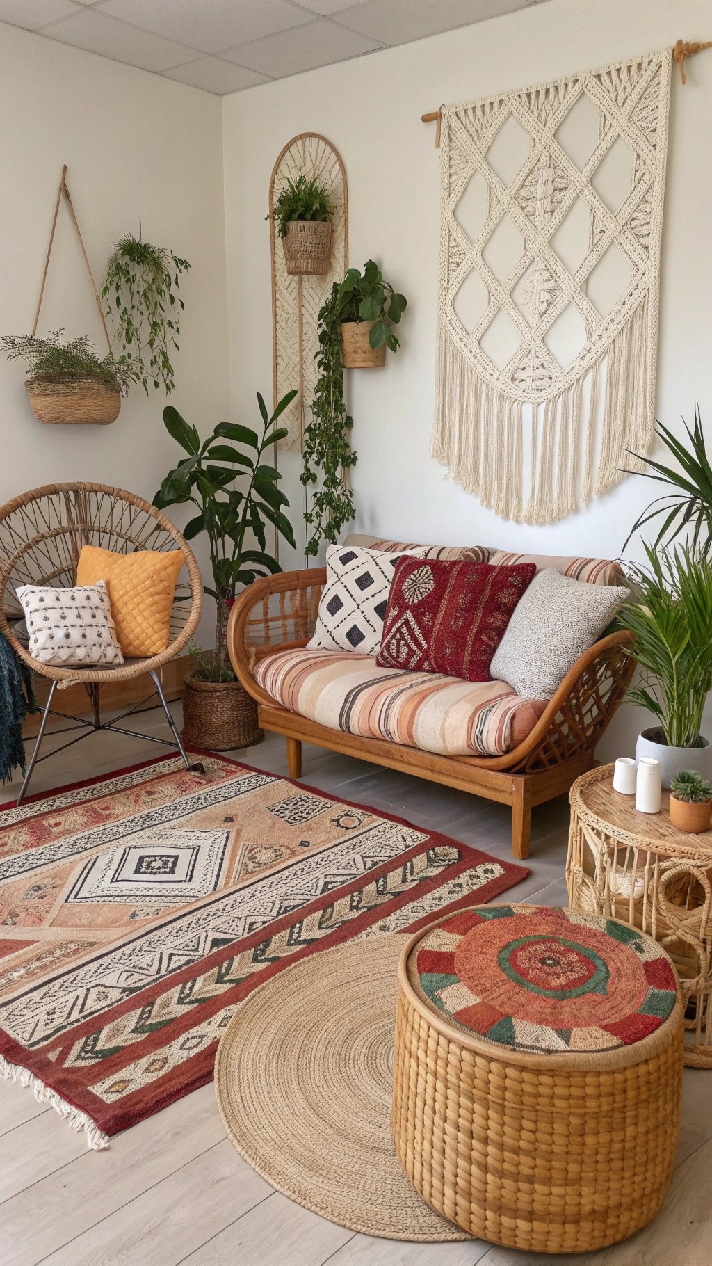 Boho living rooms celebrate creativity and individuality. Layered rugs, woven accents, and vintage finds create a cozy, collected feel. The mix of patterns and textures keeps the room visually rich yet relaxed.