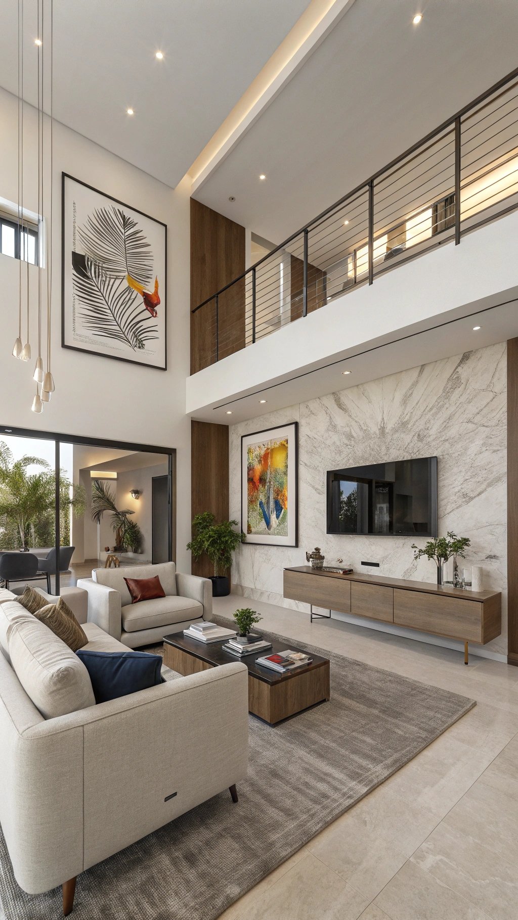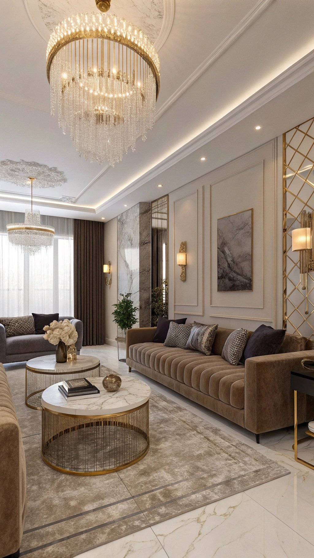 Modern glam merges luxury with modernity. Think marble coffee tables, velvet sofas, metallic finishes, and bold lighting fixtures. The look is sleek, chic, and timelessly elegant.