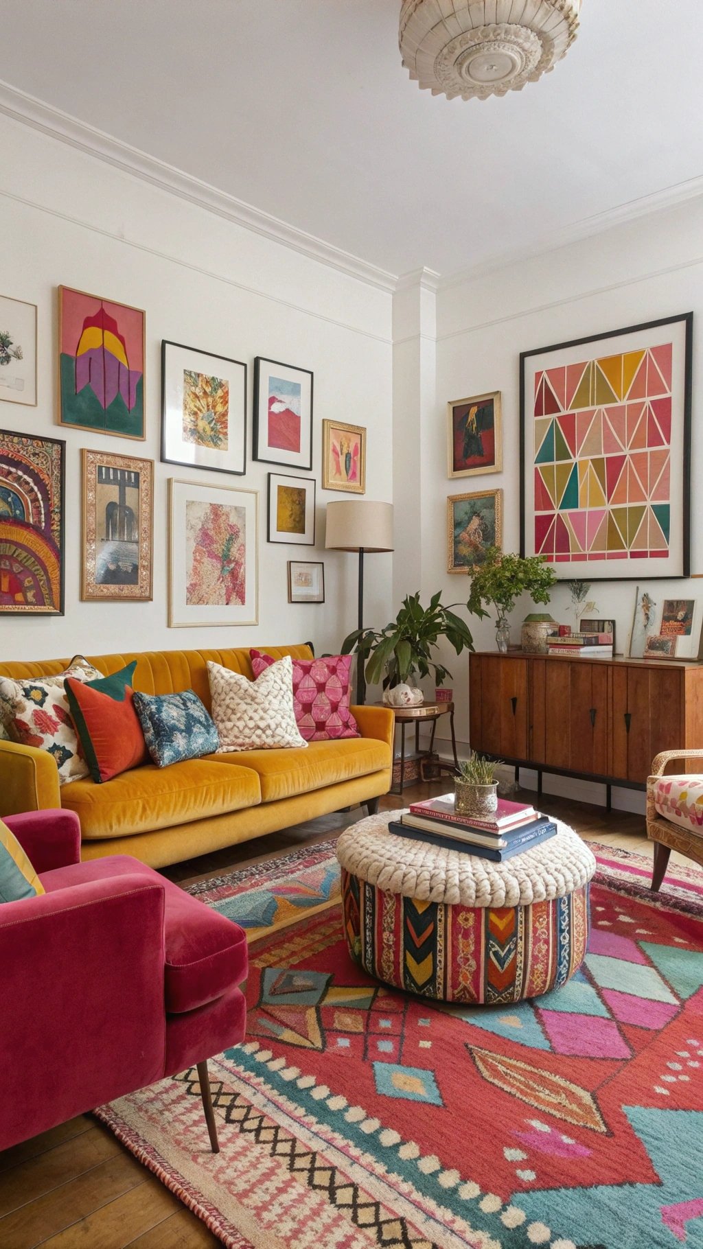 Eclectic interiors celebrate creativity through bold contrasts — think colorful art, mismatched furniture, and unexpected combinations. It’s a vibrant reflection of individuality.