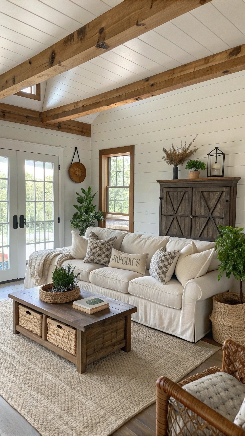 Farmhouse style captures the charm of country living with a modern twist. Shiplap walls, oversized sofas, and wooden beams create a cozy, lived-in feeling that feels both rustic and fresh.