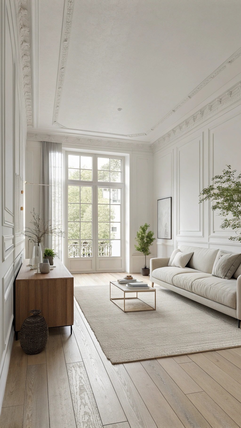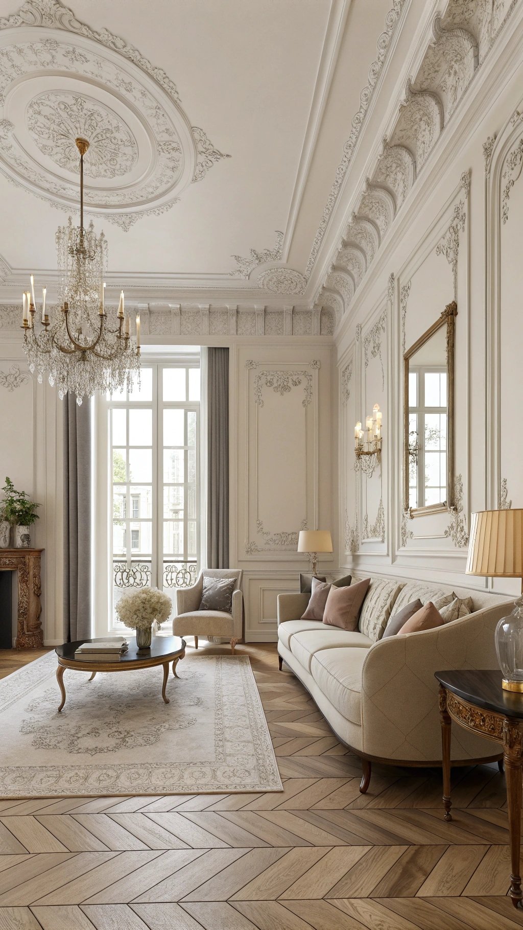 A Parisian aesthetic is effortlessly elegant. Classic molding, herringbone floors, and a mix of vintage and modern furniture create refined charm.