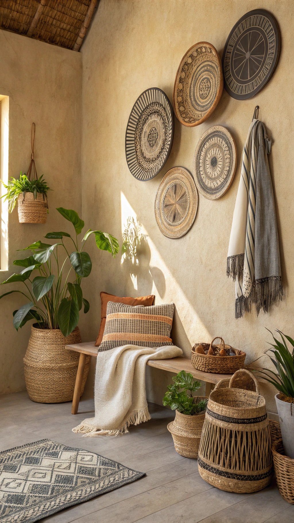 - Hang Zulu baskets as wall art for texture and movement.