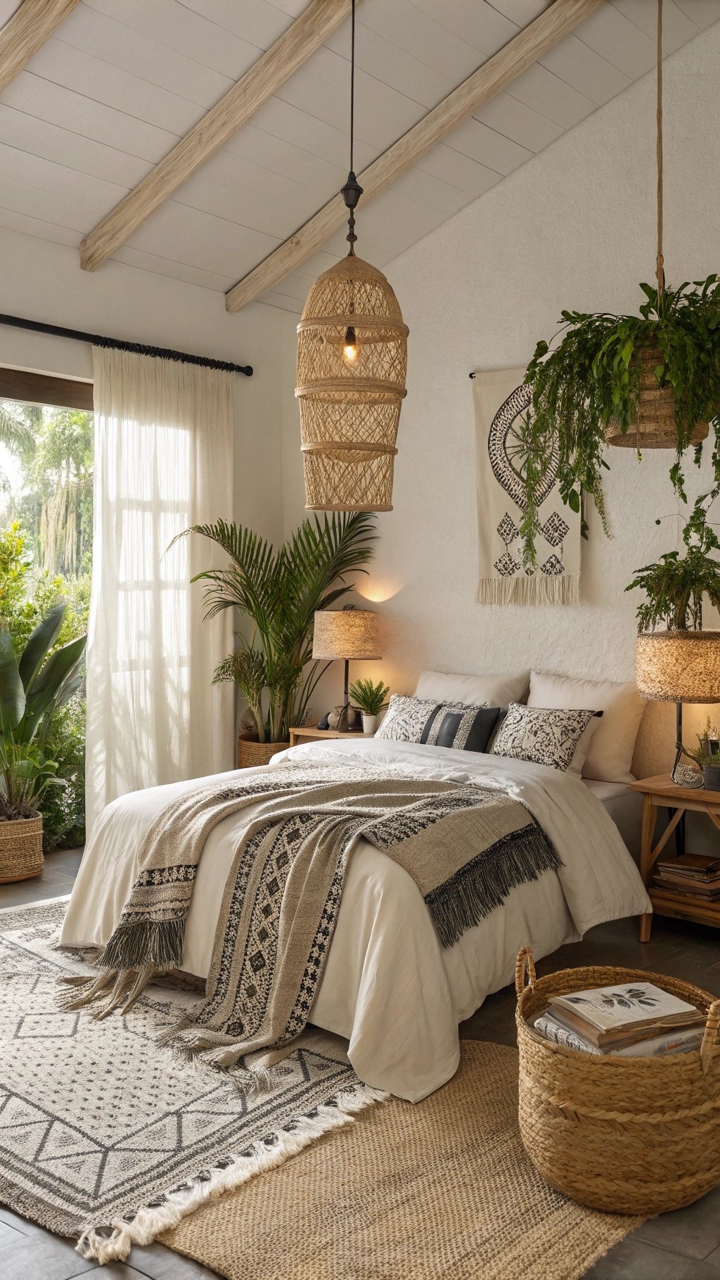 - Wood or rattan bedside tables with warm lamps.