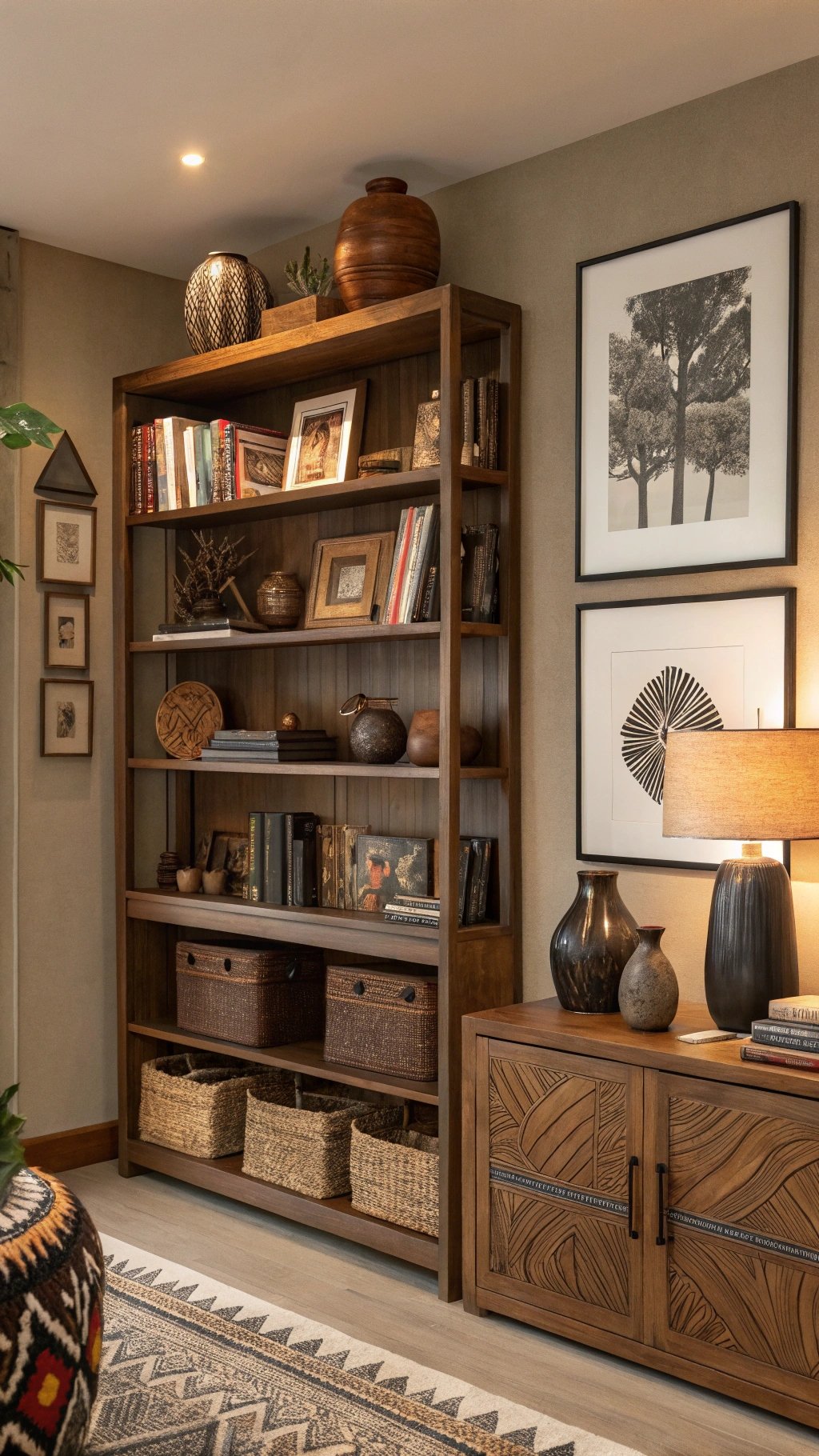 Turn your shelves into a mini gallery. Mix art books, ceramics, tribal-inspired artifacts, and framed photos.