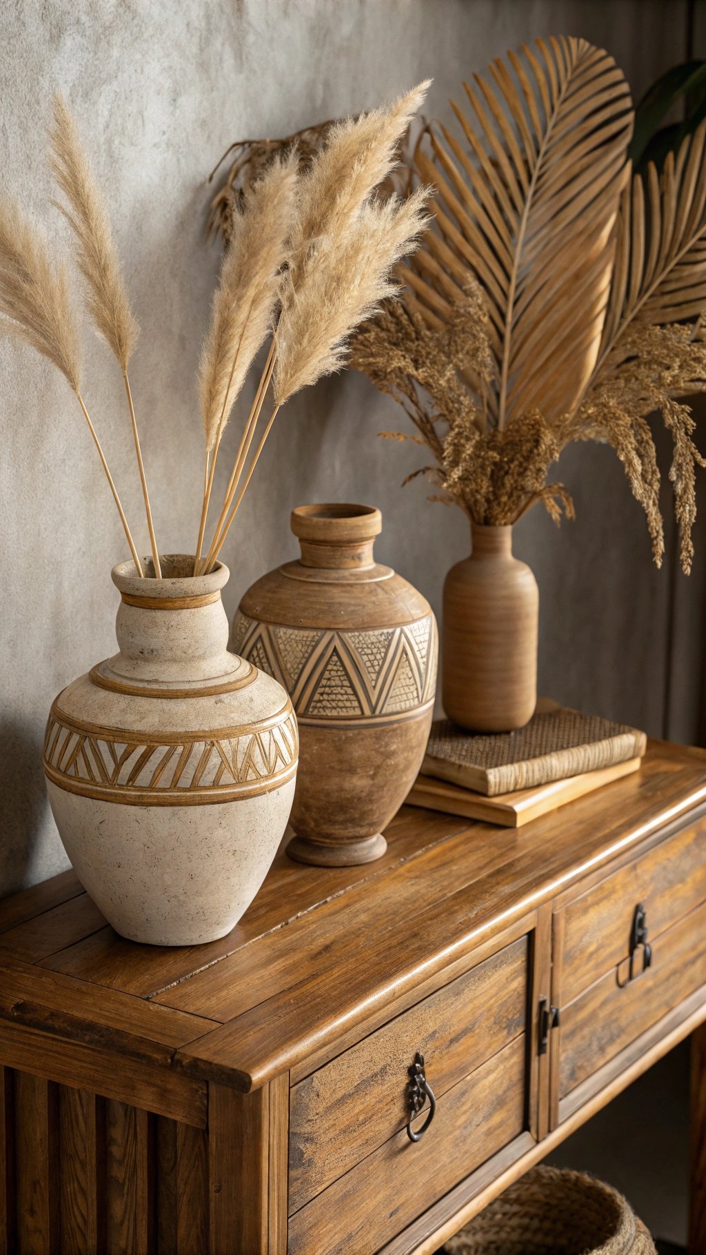 - Mix smooth ceramics with woven baskets and carved wood.