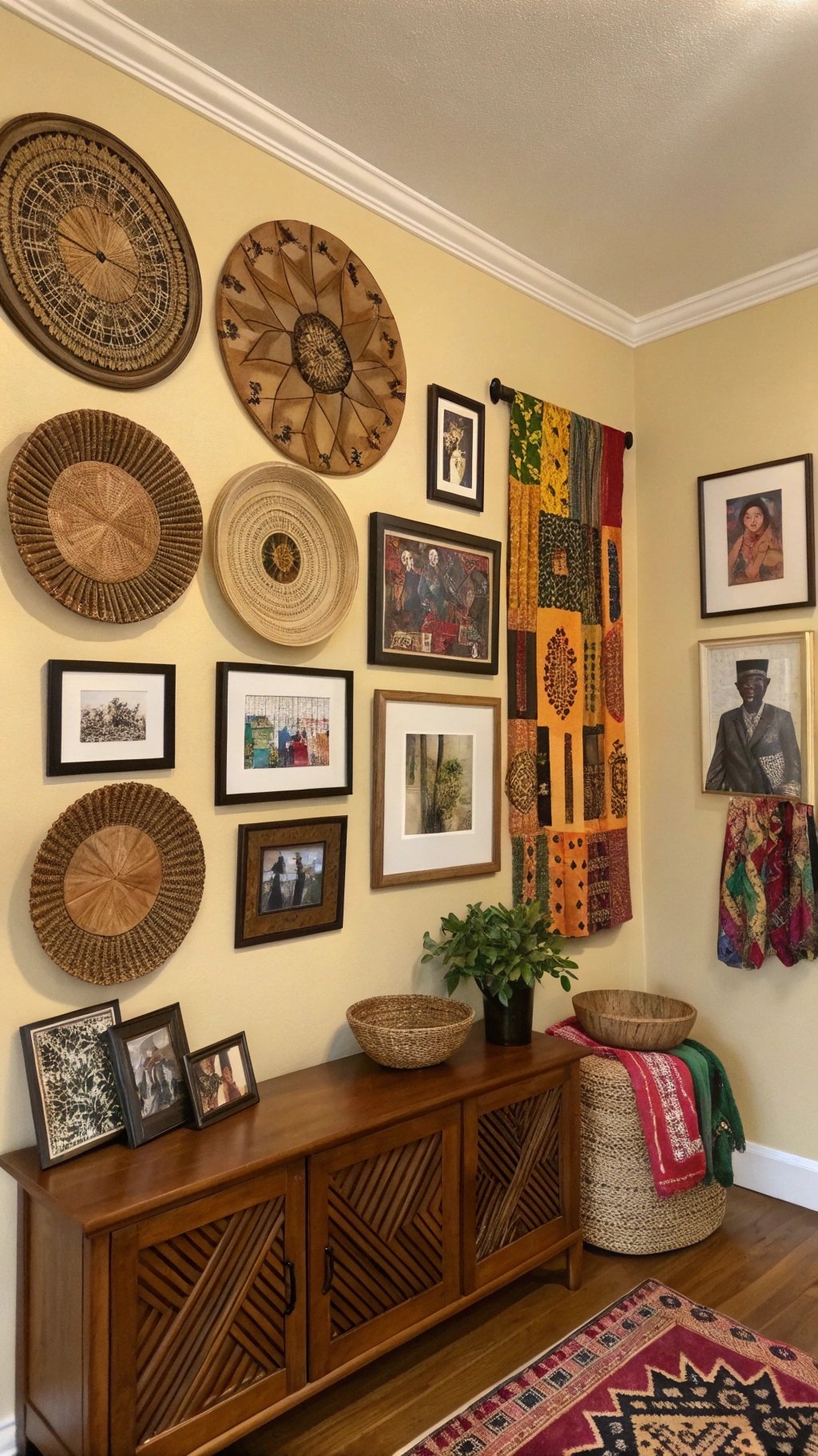 Turn a blank wall into a storytelling moment. Combine woven fans, artisan prints, family photos, and textiles for a layered look.