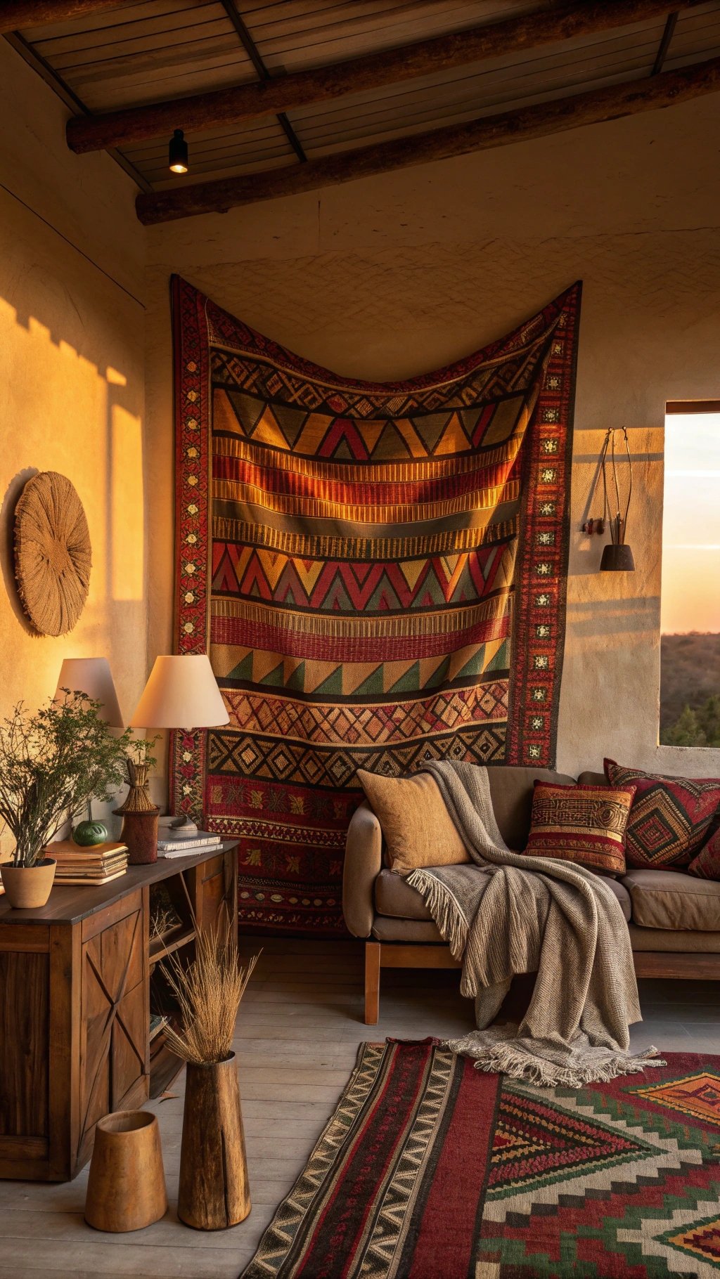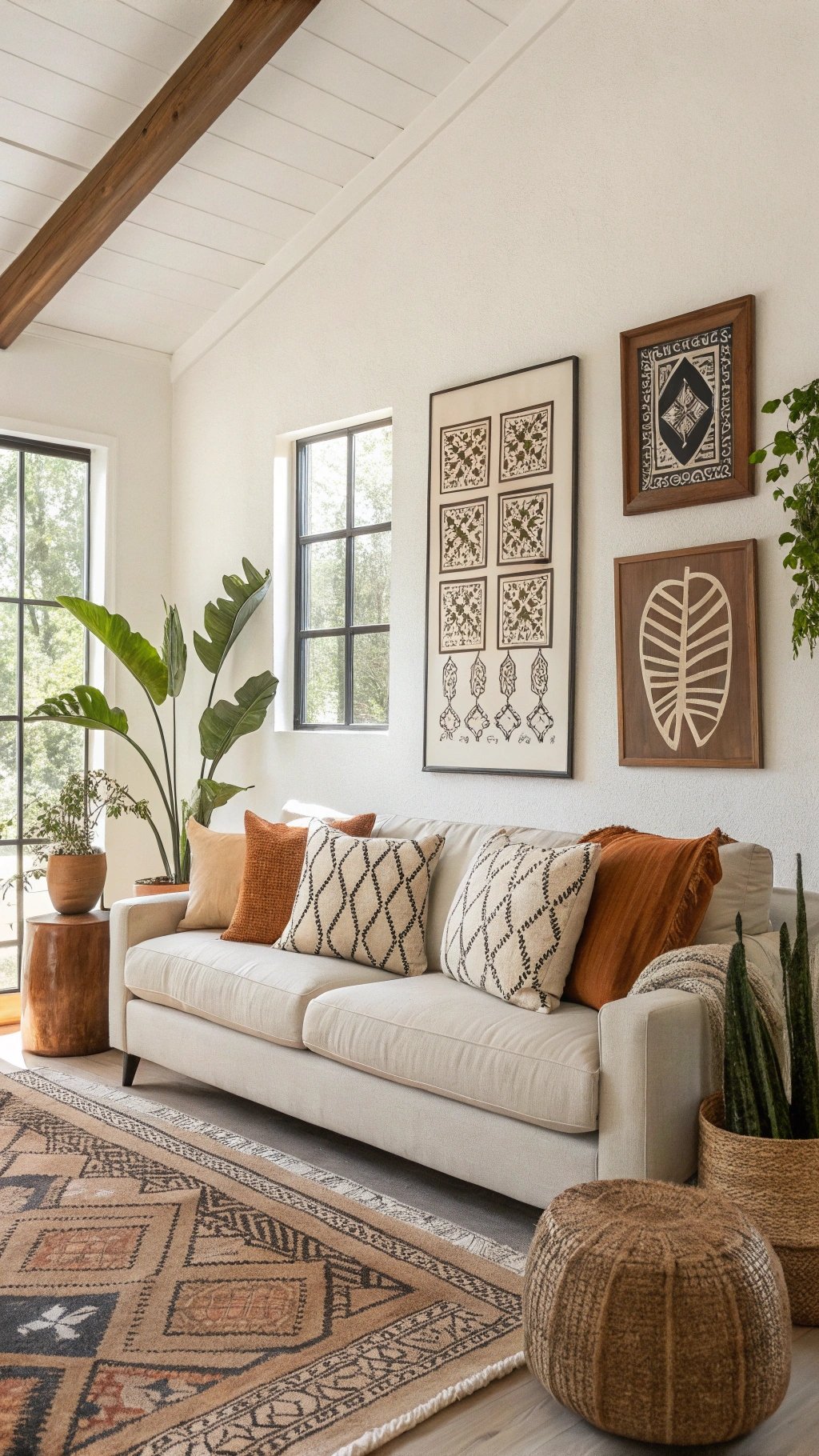 Rugs set the tone. Look for jute, wool, Berber-inspired, or flatweave tribal patterns for the perfect base.