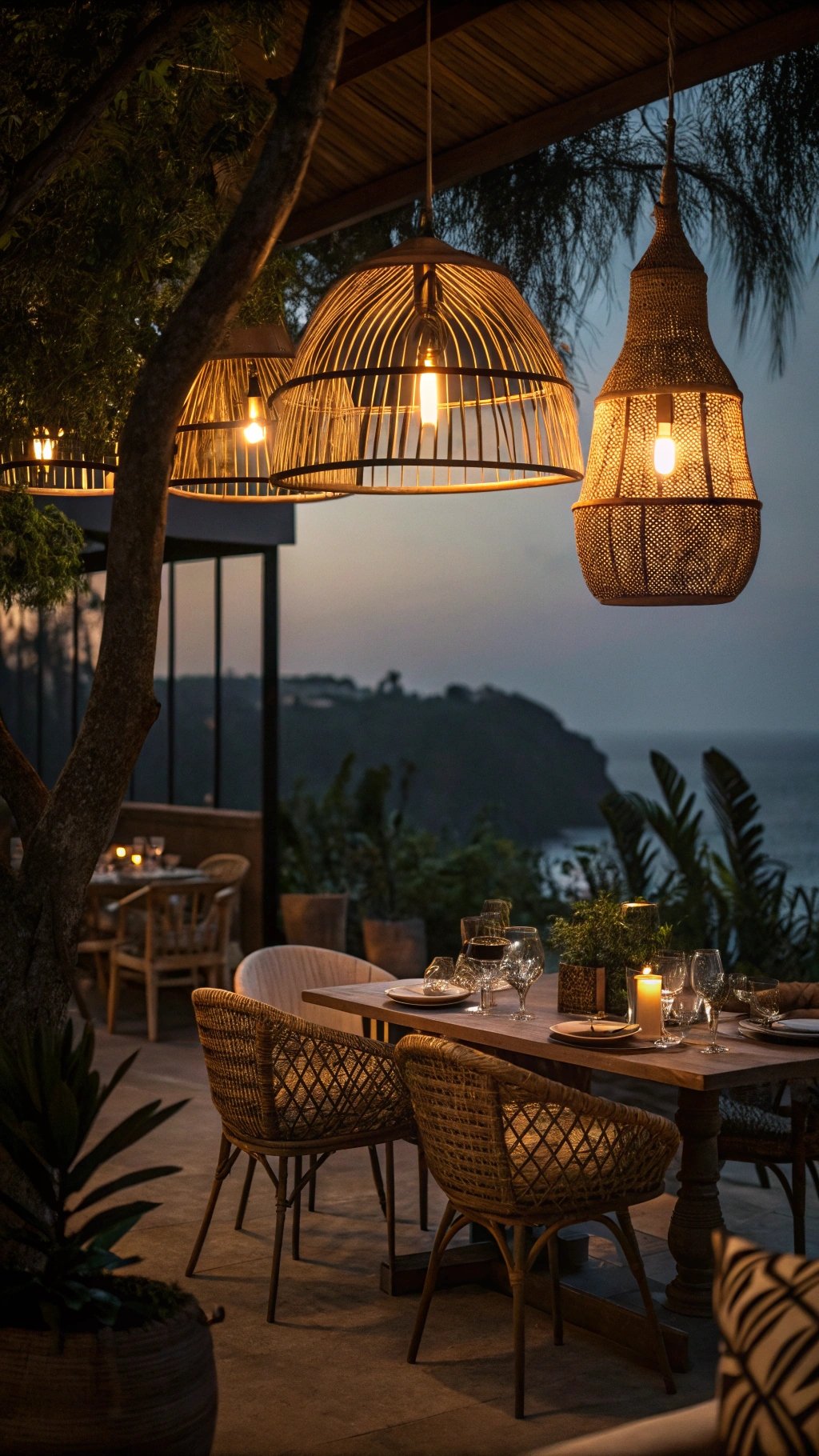Lighting is mood. Layer pendants, floor lamps, and table lamps with woven or perforated shades for warm, patterned glow.