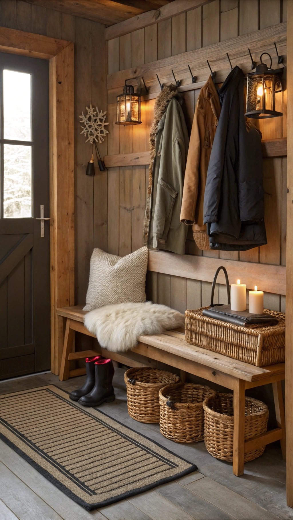 • Entryway boot zone: slatted mat, sturdy hooks, and a bench with a wool cushion.