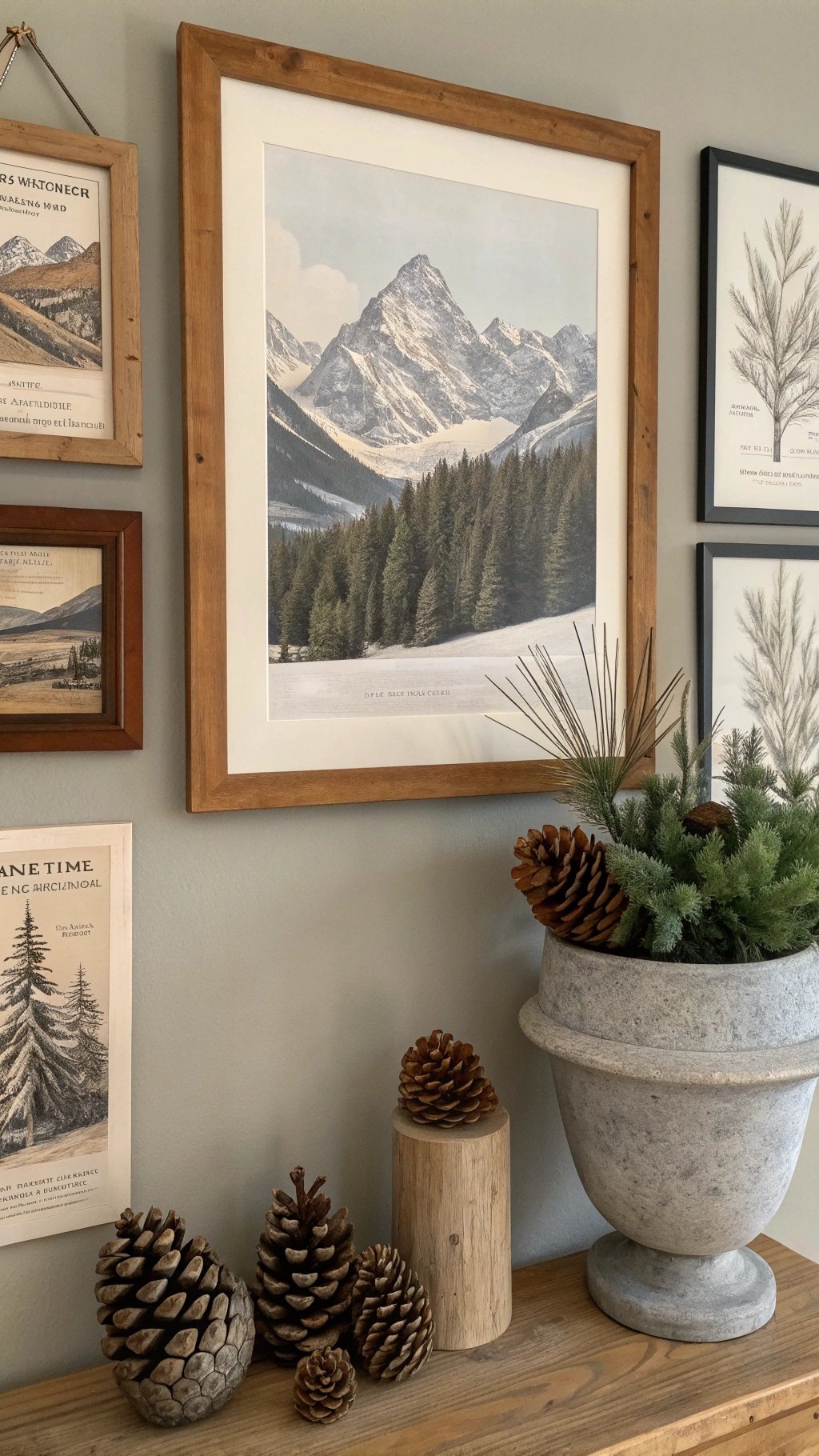 • Botanical sketches: pine, fern, or wildflower studies in thin black frames.
