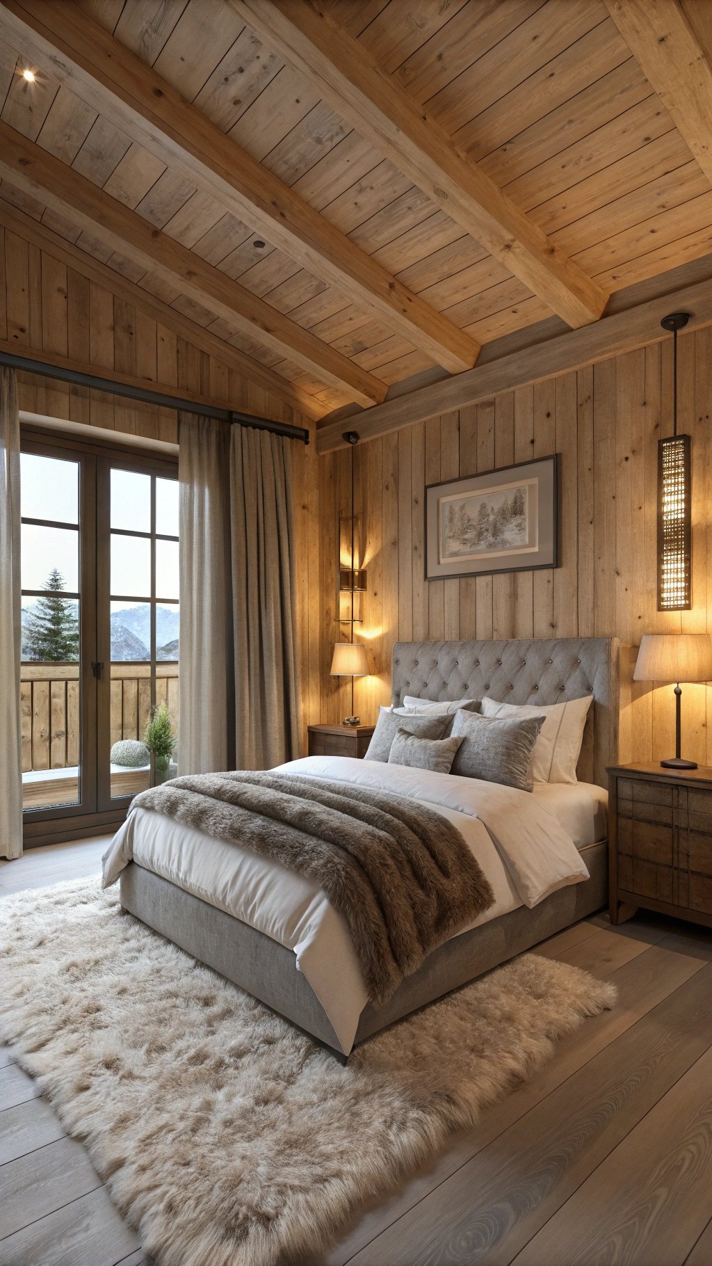 The alpine bedroom is where coziness peaks (pun absolutely intended). Layers are everything.