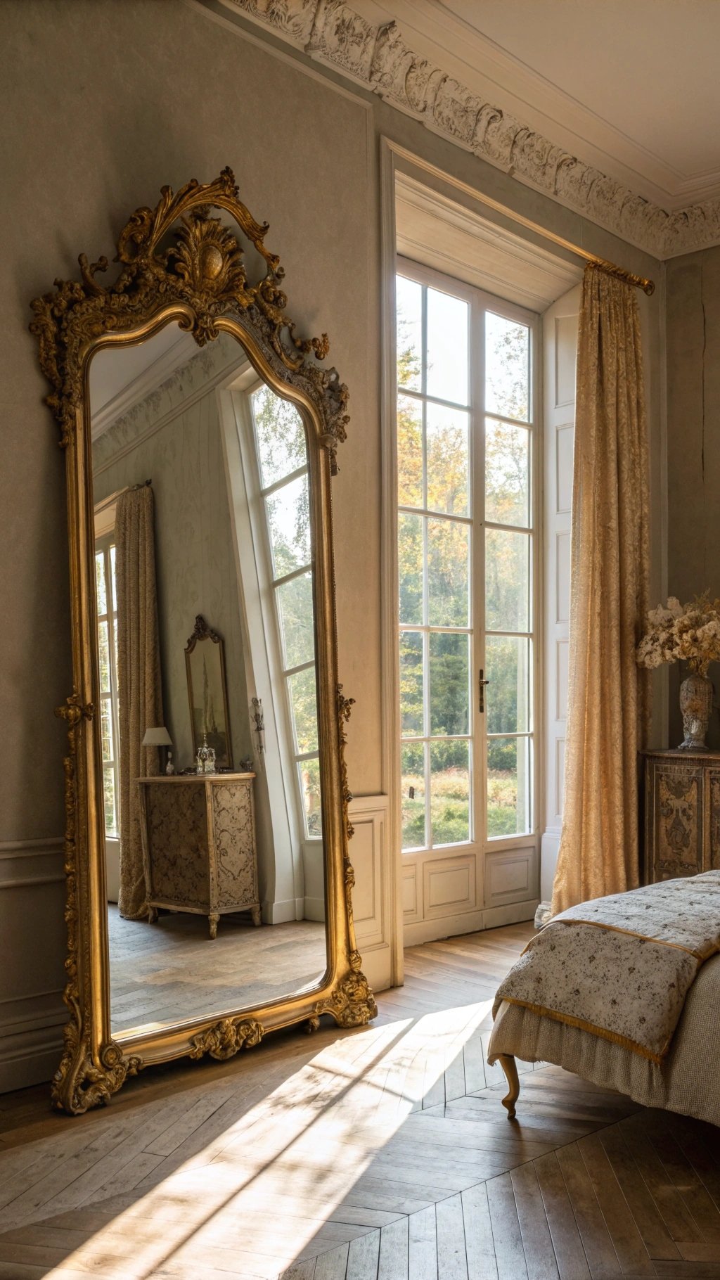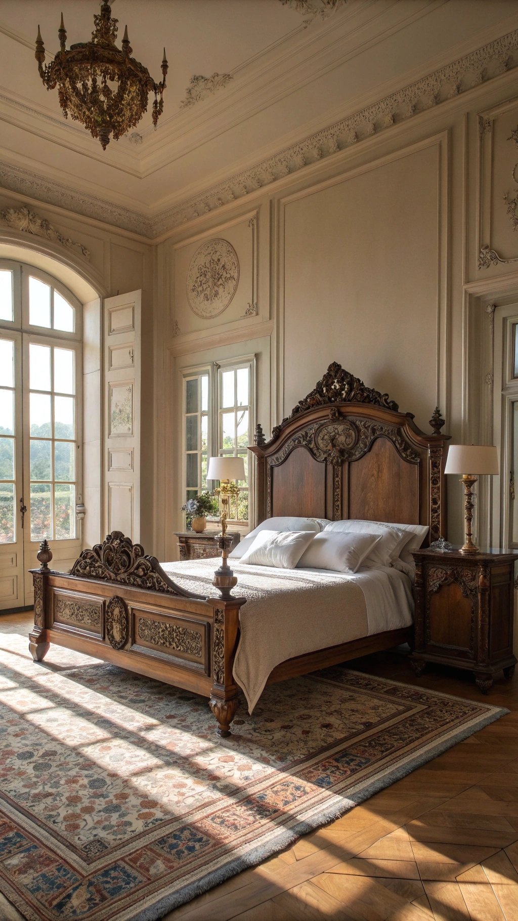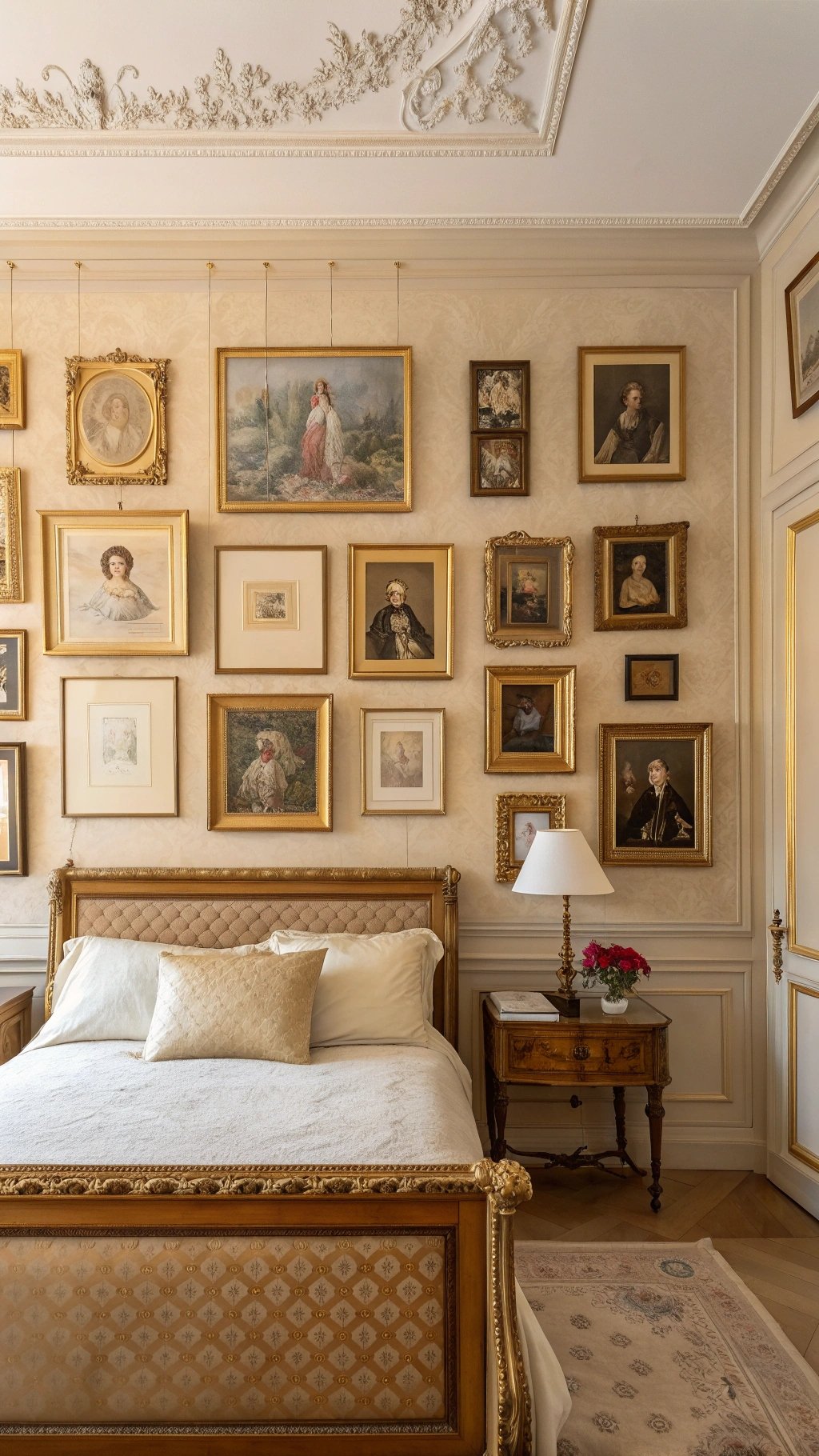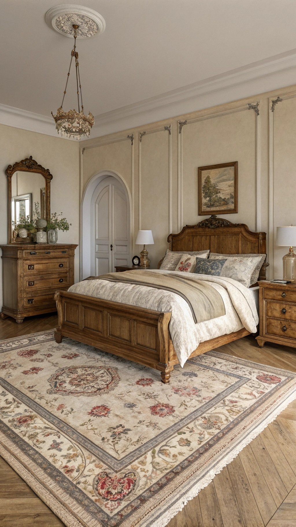 Start with the showstopper: an antique bed. Think wrought iron, carved mahogany, or a French-style cane headboard. The bed sets the tone for the whole room—dramatic, romantic, and instantly timeless.