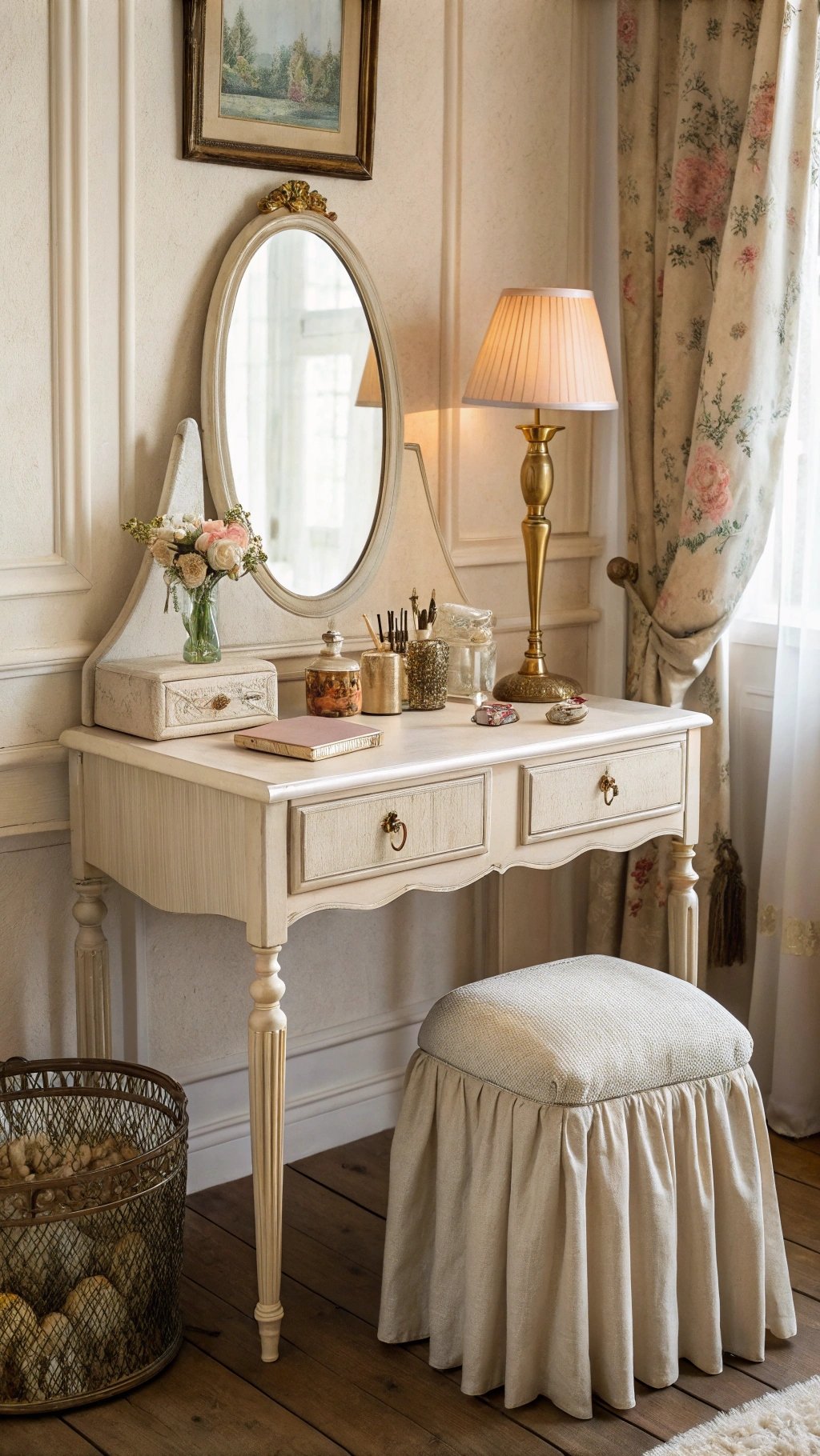 A petite antique desk or vanity gives you a place to get ready, journal, or pretend you’re drafting love letters. It’s romantic without trying too hard.
