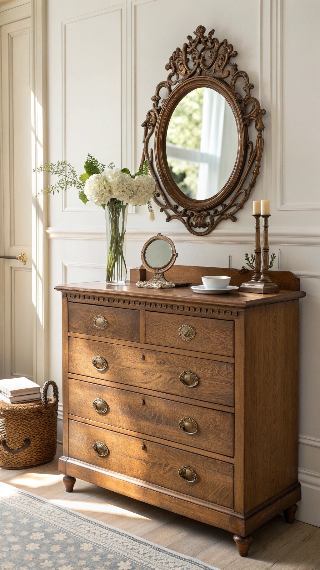 - Place a vintage mirror above for light and symmetry.