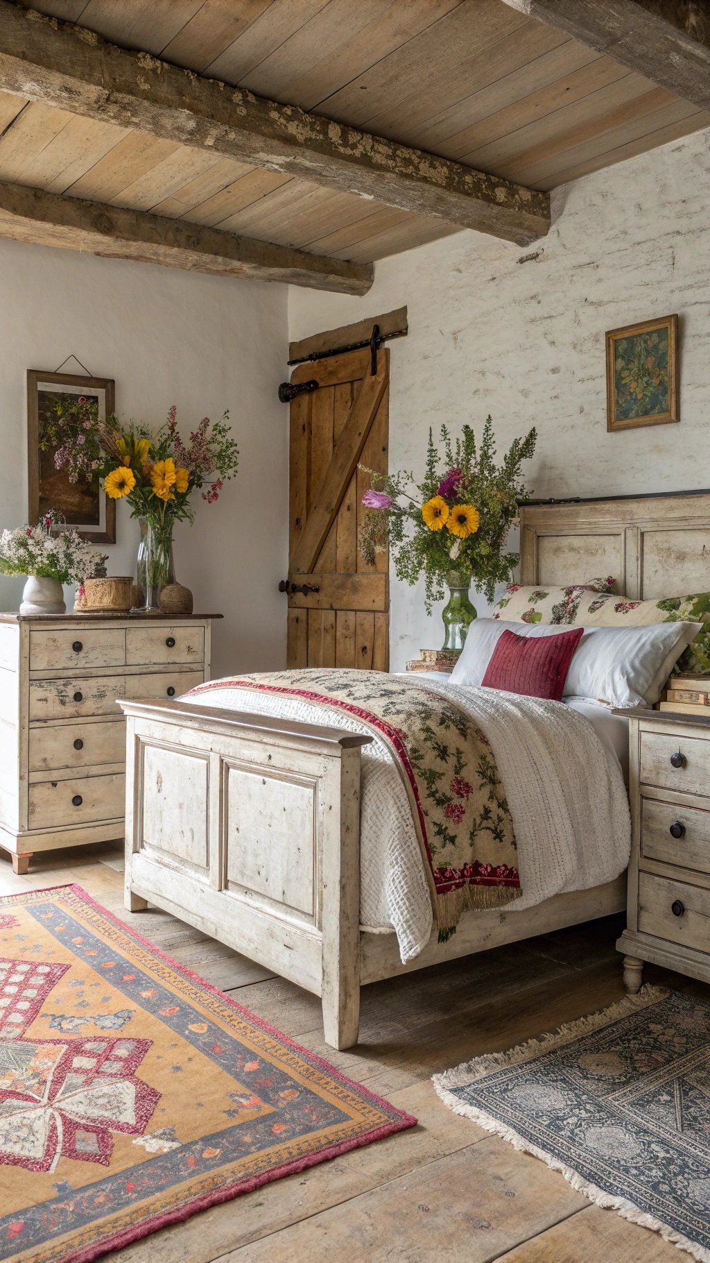 Layering an antique rug pulls everything together and feels luxe underfoot. Persian, Turkish, or faded floral—choose one that complements your bedding, not fights it.