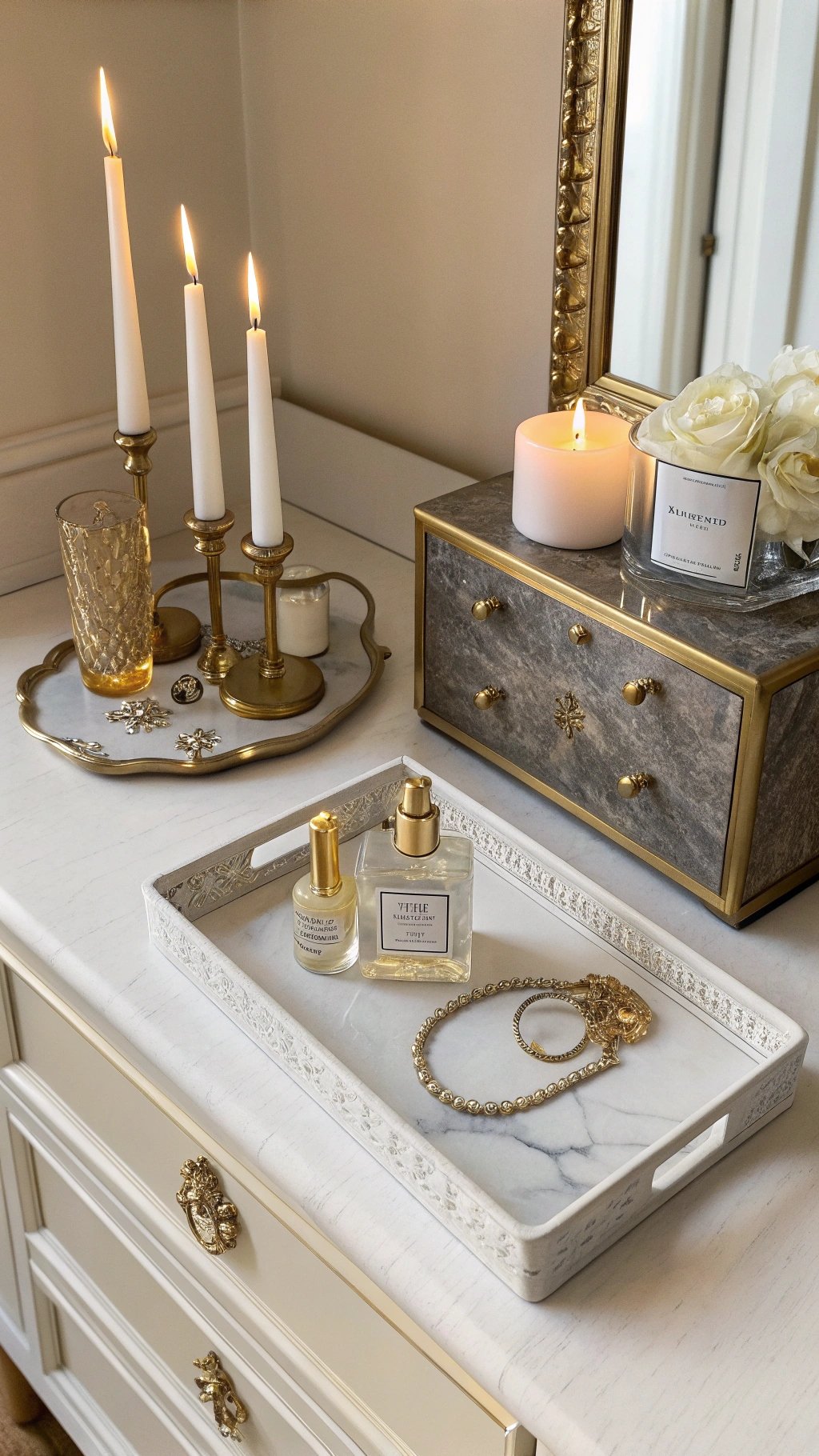 - Use a silver tray for perfumes—instant hotel vibes.