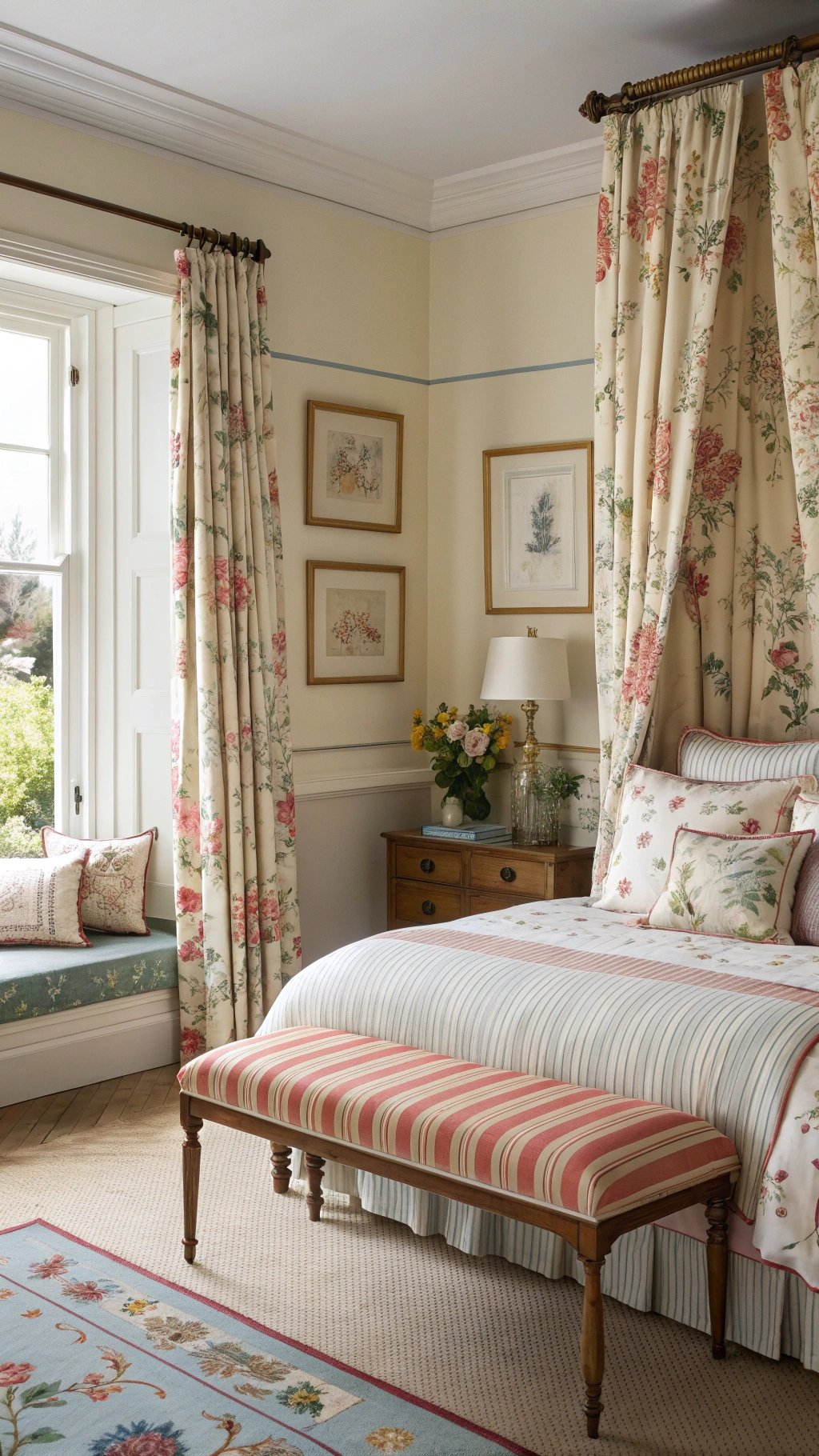 - Start with a neutral base and add one patterned layer—florals or toile are classic.