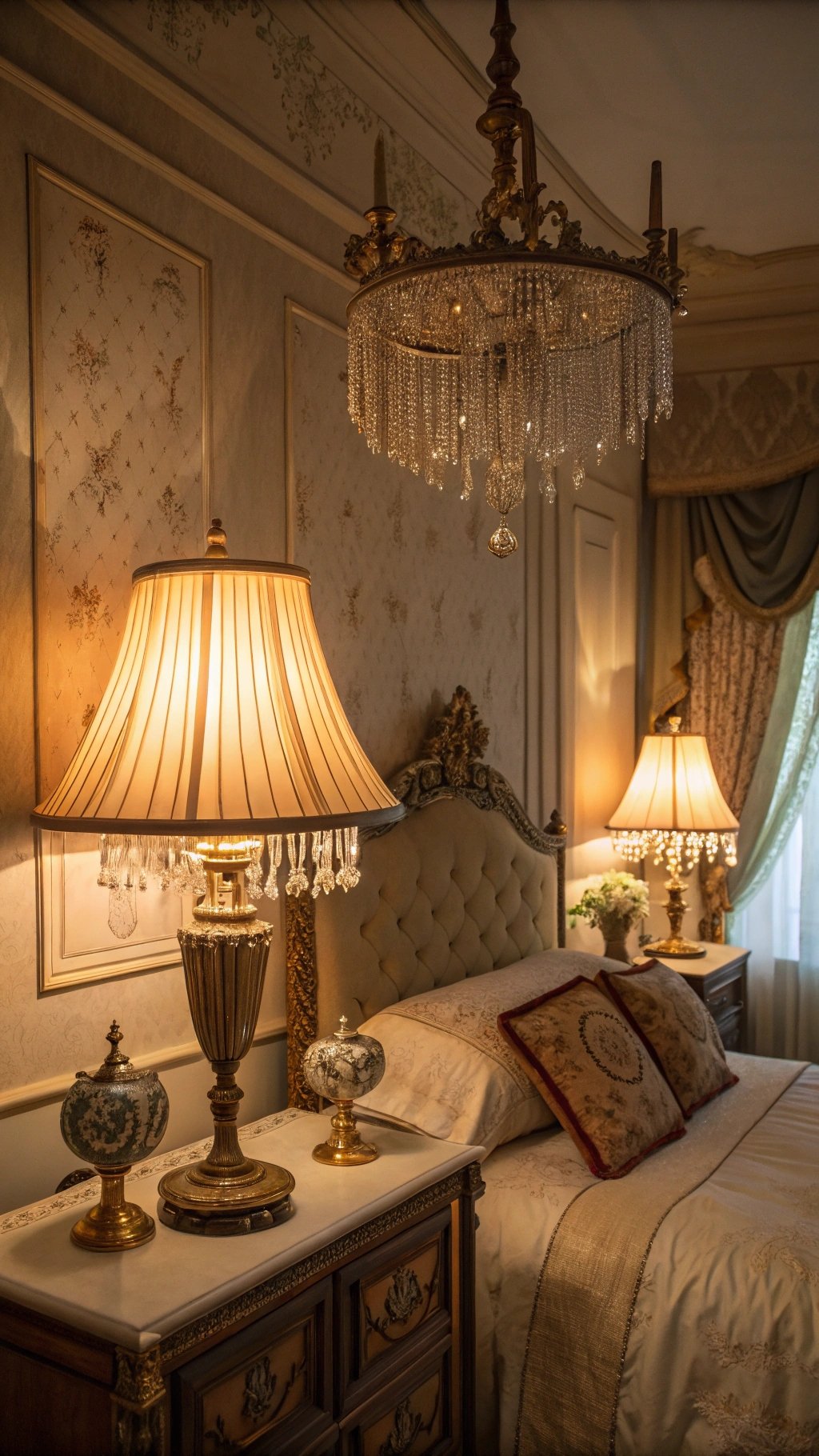 Harsh ceiling lights? Hard pass. Vintage lighting gives your room that warm, flattering glow. Think alabaster table lamps, pleated shades, or a petite chandelier.