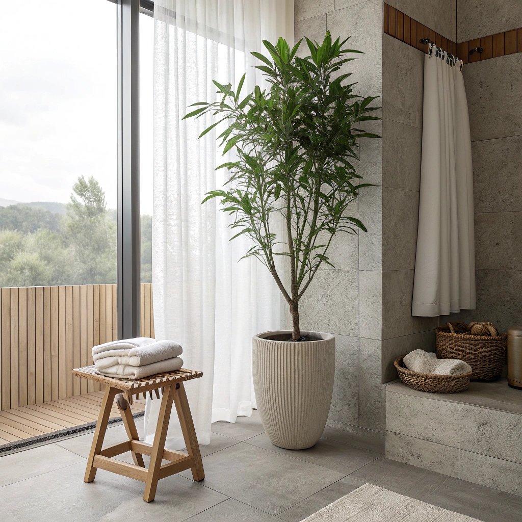 Introduce moisture-loving plants (ferns, pothos, ZZ) and pair them with stone textures and natural fibers. Use ribbed or frosted glass to diffuse daylight and create a leaf-dappled feel.