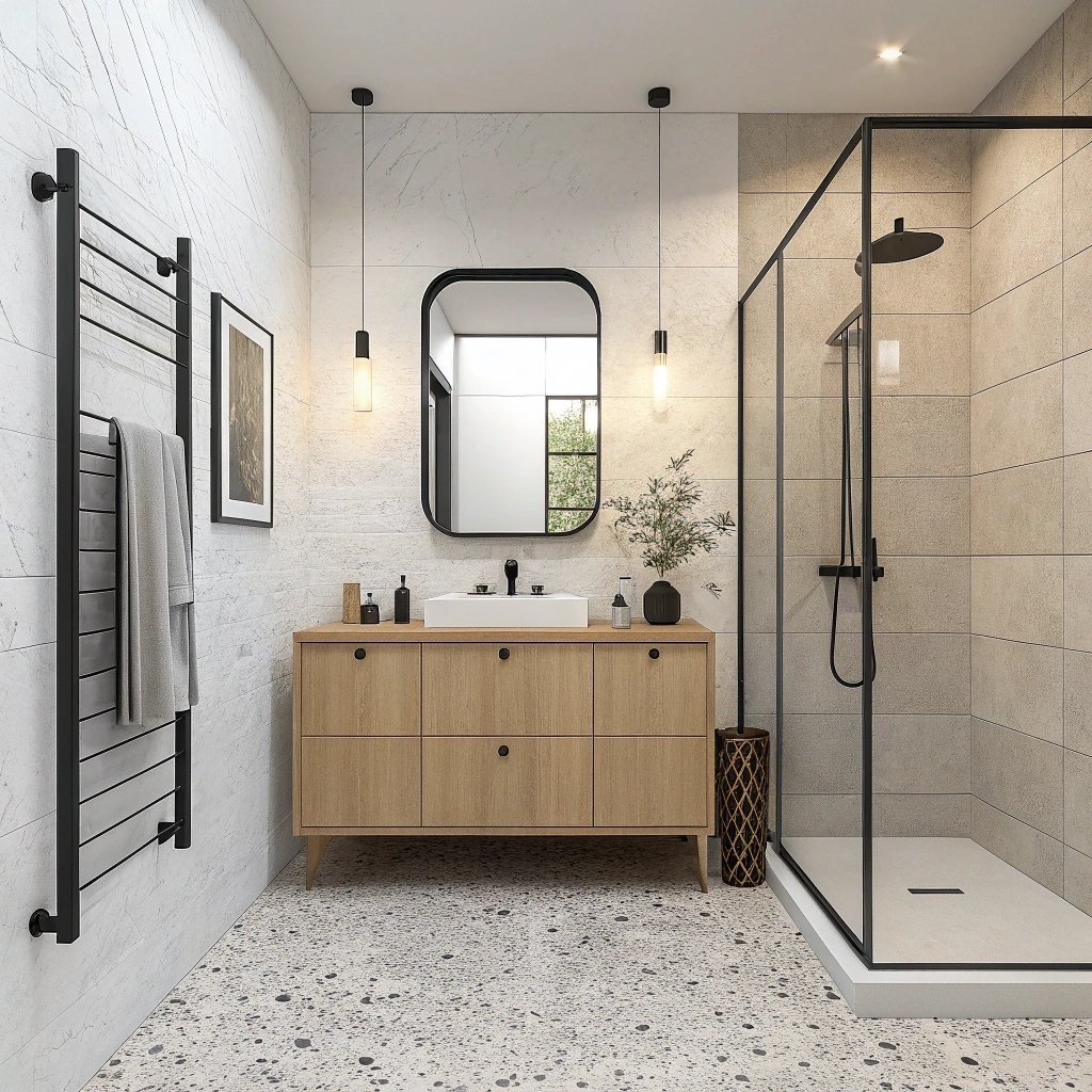 High contrast, zero fuss. Pair matte black fixtures with bright white walls and a pale stone or terrazzo floor. Add a thin black frame around the mirror and shower to tie lines together.