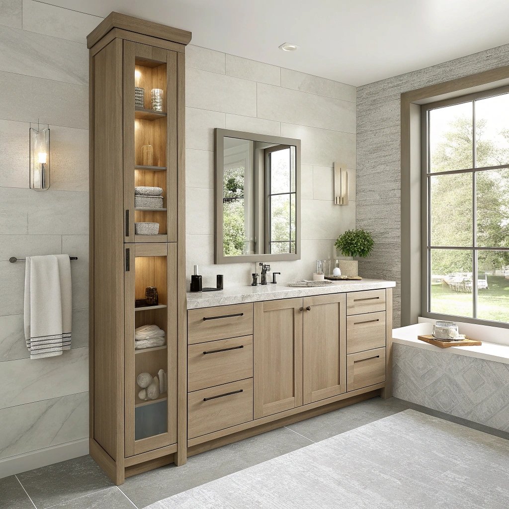 Calm follows storage that disappears. Recess a mirrored cabinet between studs, add a tall linen cupboard with a pocket door, and run a slim stone ledge around the room for daily items. Drawer inserts corral tools so counters stay clear and wipe-downs are quick.