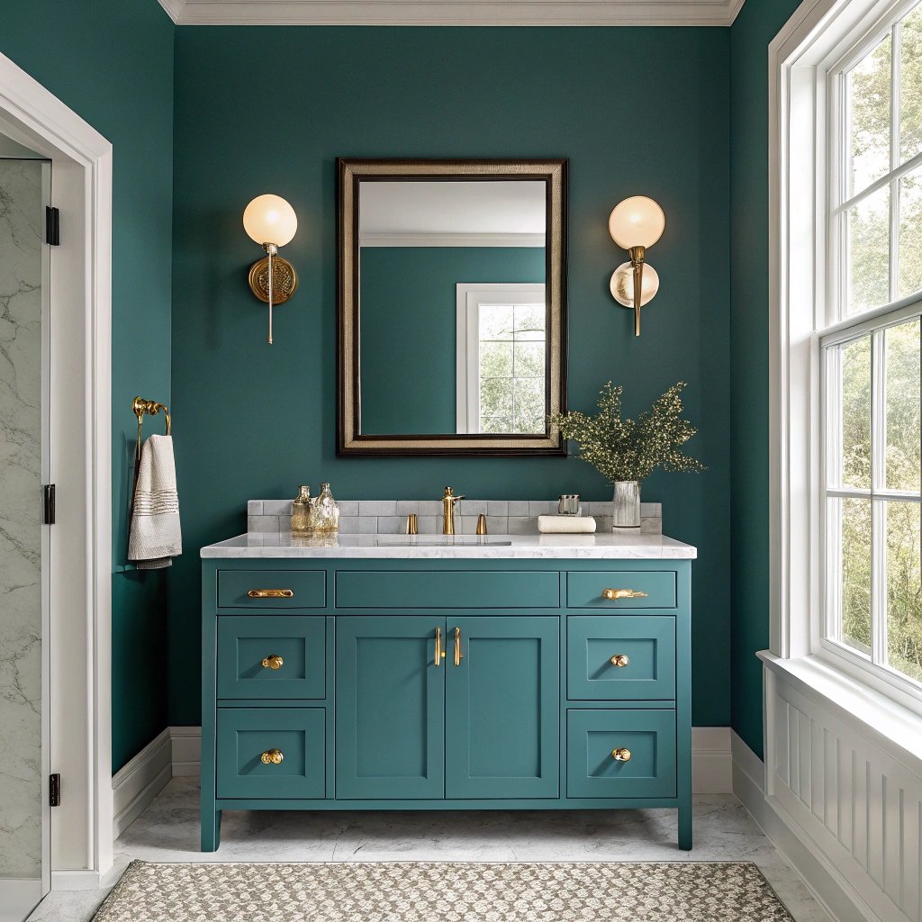 Go all-in on a single saturated hue—deep teal, olive, or oxblood—across the vanity wall, cabinetry, and mirror frame. Keep ceilings and adjacent walls light to let the color breathe.