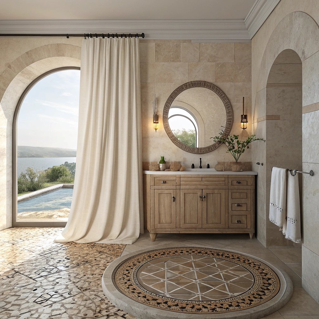 Curves improve flow, reduce visual tension, and flatter faces in the mirror. Pair with low-contrast neutrals and tactile stone for a bathroom decor mood that is calm but not plain.