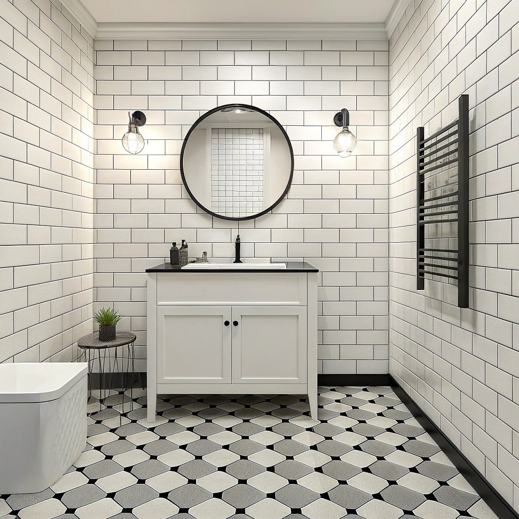 Pattern can be the art when square footage is tight. A cream-and-charcoal checkerboard floor paired with stacked-vertical white subway walls creates crisp geometry without feeling busy.