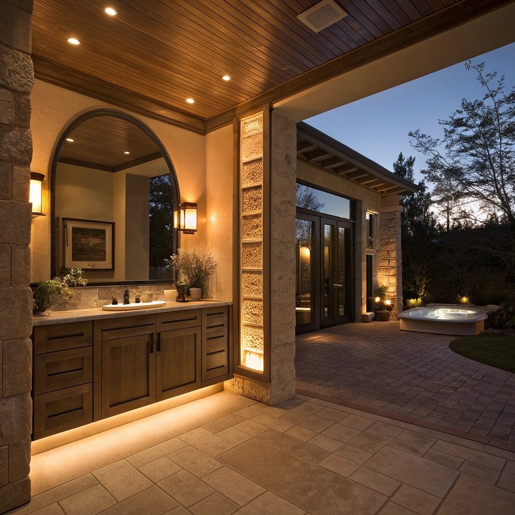 Warm temperatures (2700–3000K) flatter skin and surfaces. Separate dimmers create scenes for wake-up bright, makeup task, and wind-down soak.
