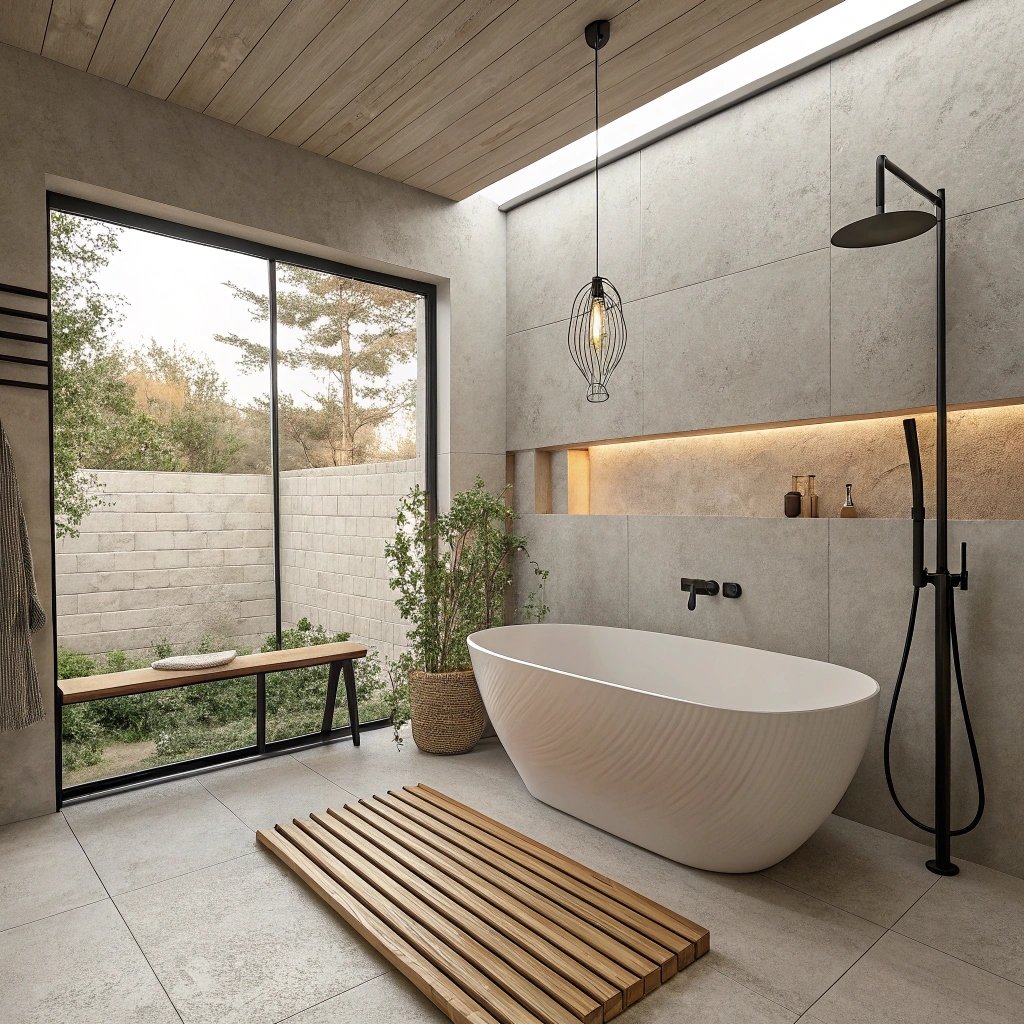 Blend Japanese restraint with Scandinavian warmth to create a minimal, welcoming wash space. Use light ash wood accents, smooth plaster or microcement walls, and large-format tile to reduce grout lines.
