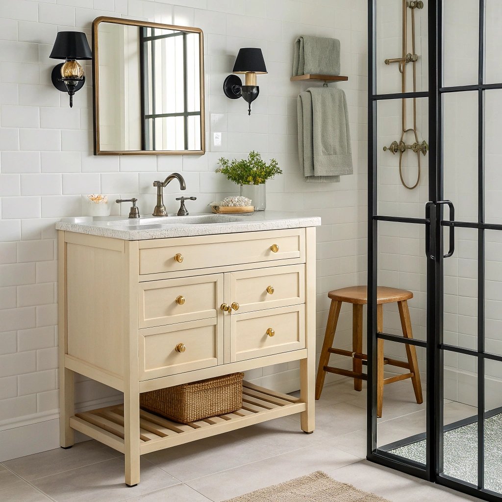 Add cream-matted art or alabaster sconces to give the eye rest. Because everything functional is wrapped in one tone, counters look tidier, and the bathroom decor reads intentional, cohesive, and easy to maintain.