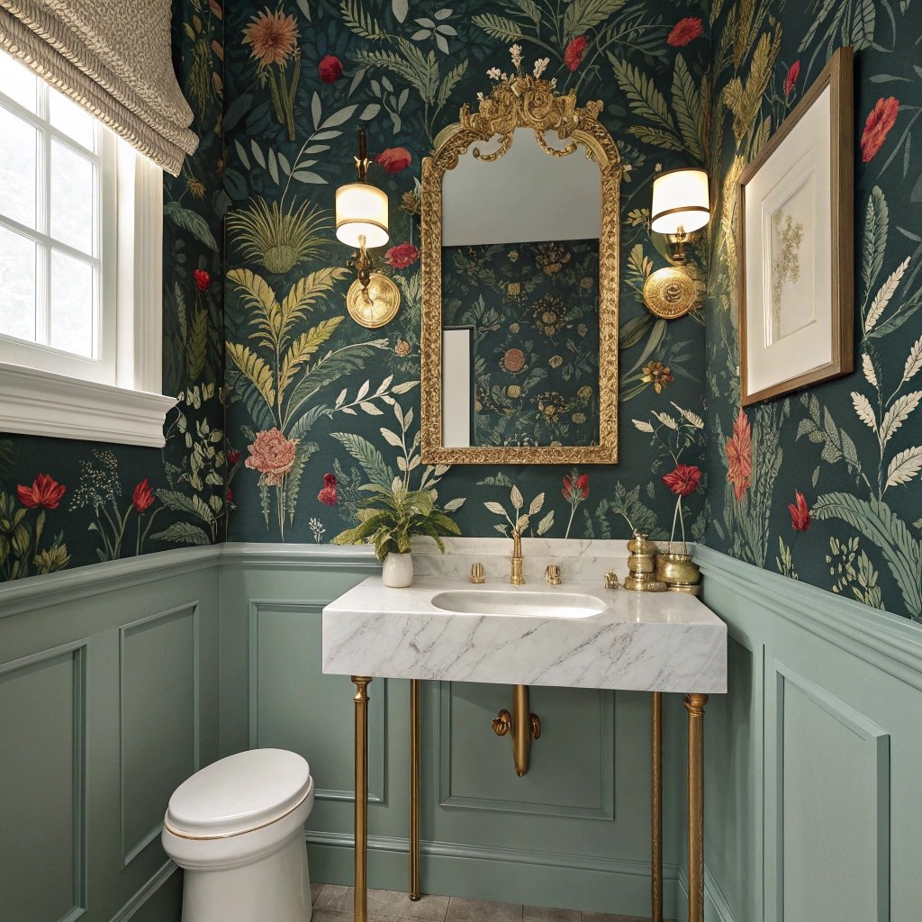 Small size invites big personality. Use patterned wallpaper, high-gloss wainscot, or a saturated paint wrap for instant drama.