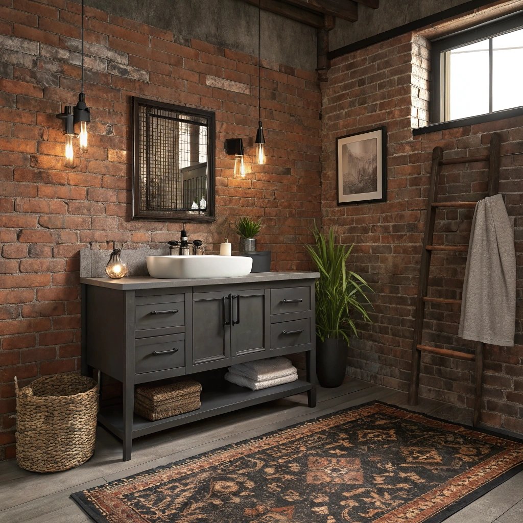 Expose the character—brick or concrete—then soften with plush textiles and warm wood. Use charcoal or black flat-front vanity fronts, a reclaimed-wood shelf, and black steel lighting.