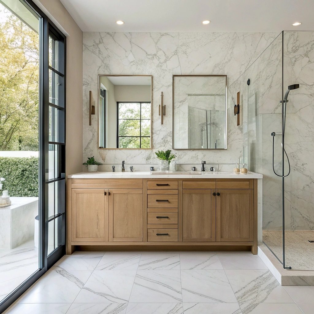 Let veining lead the story with a single stone that runs from countertop to full-height backsplash or shower wall. Keep cabinetry quiet—putty or natural oak—to highlight the geology.