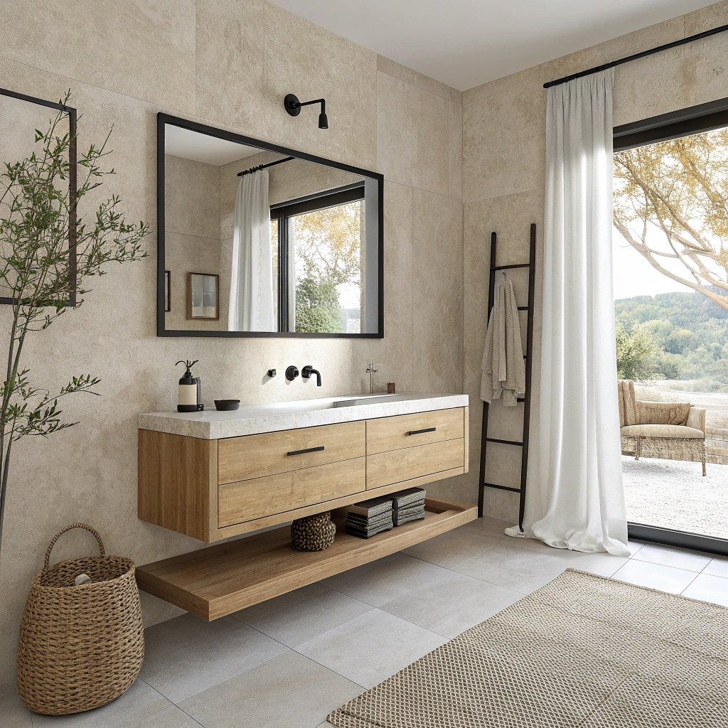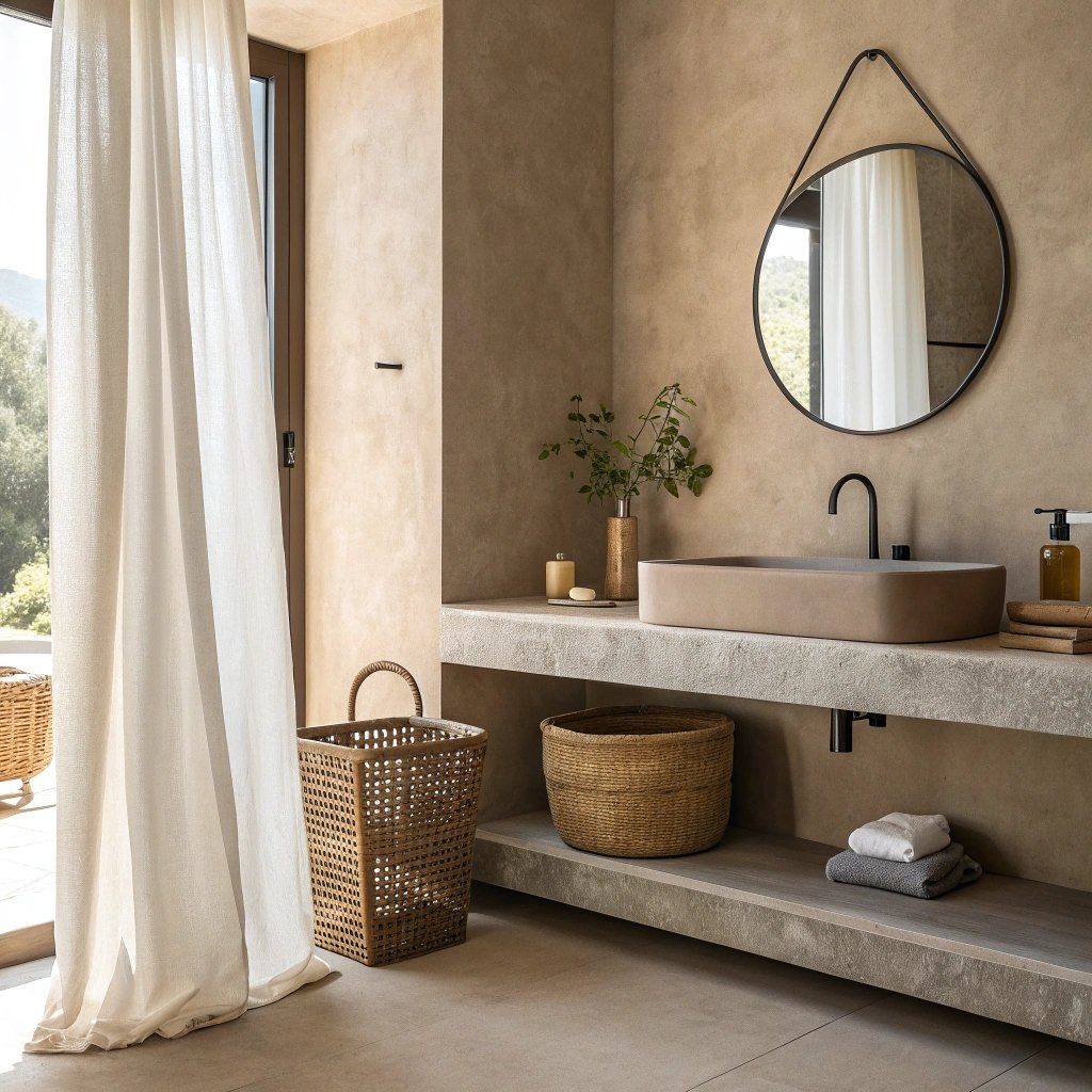 This bathroom decor approach leans on depth, not clutter. Limewash or microcement walls introduce soft movement, while wall-mounted taps free counter space and keep the silhouette clean.