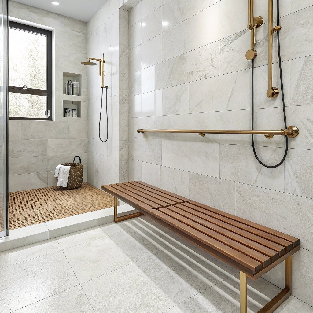 Treat supports as jewelry: powder-coated or brass grab bars aligned with grout lines, a teak bench, and large-format anti-slip tile that reads high-end.