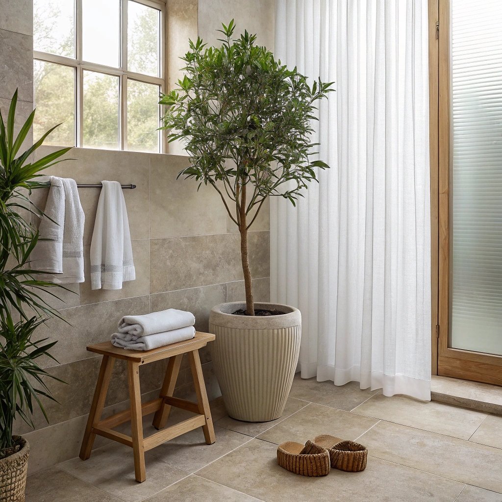 Scale and sensory design matter. Pair greenery with boucle or waffle towels and a stone tray for a diffuser. Keep finishes matte and colors moss, ecru, and bone.