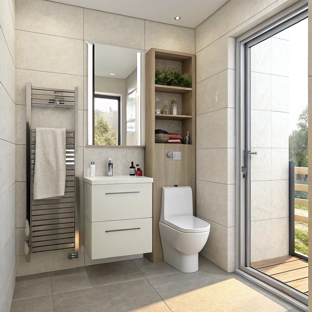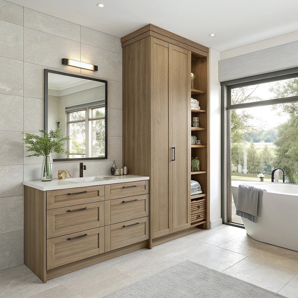 Clutter kills calm. Recess cabinets between studs, add a full-height linen cupboard with a pocket door, and build a ledge shelf that wraps the room at 1.2m height.